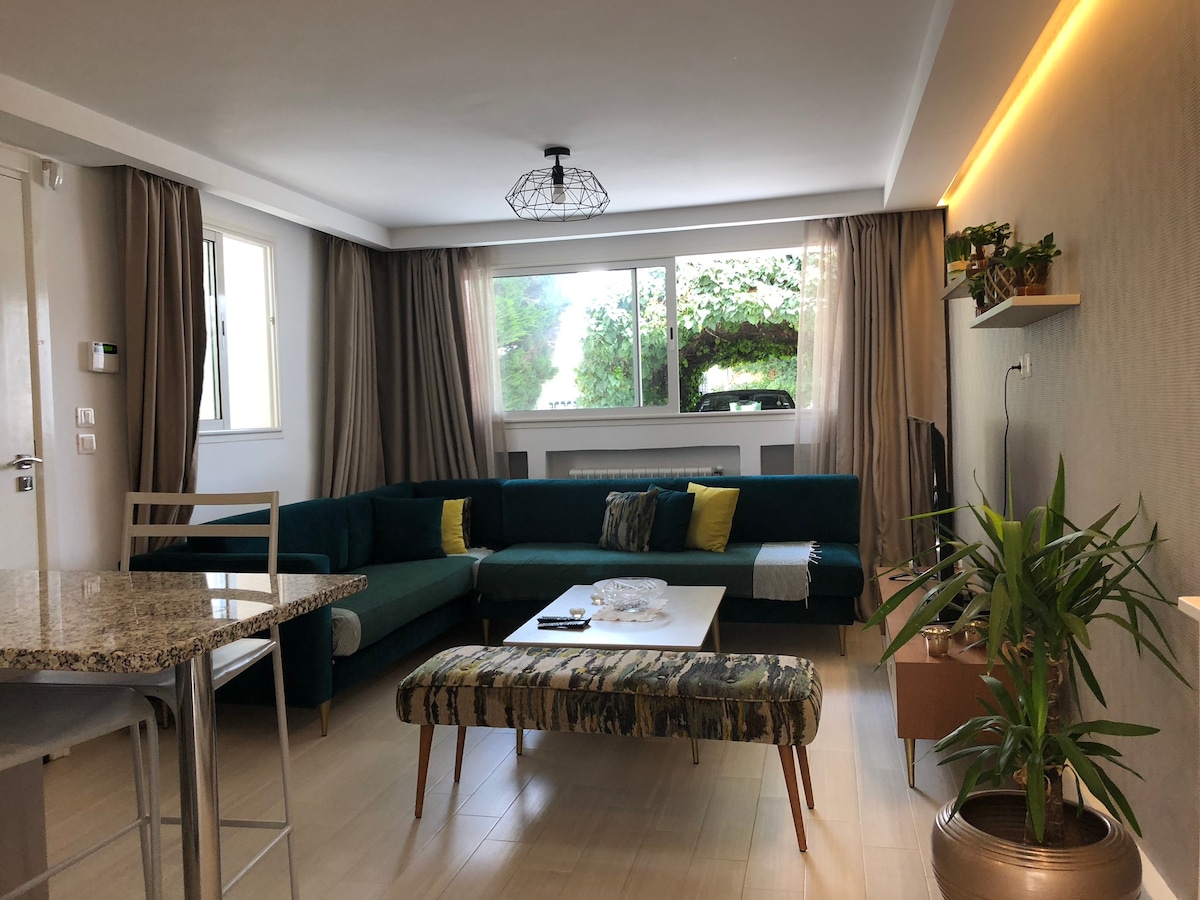 Falleg íbúð staðsett í Les Jardins de Carthage. Þessi bjarti og friðsæli staður býður upp á rúmgóða og stílhreina stofu, hlýlegt svefnherbergi og nútímalegt baðherbergi sem er smekklega innréttað. Í 15 mínútna fjarlægð frá flugvellinum er auðvelt að njóta sögulegs auðæfa Carthage, sólríkra stranda La Marsa og sjarma Sidi Bou Said. Íbúðin er fullbúin til að mæta þörfum þínum og veita þér hámarksþægindi!