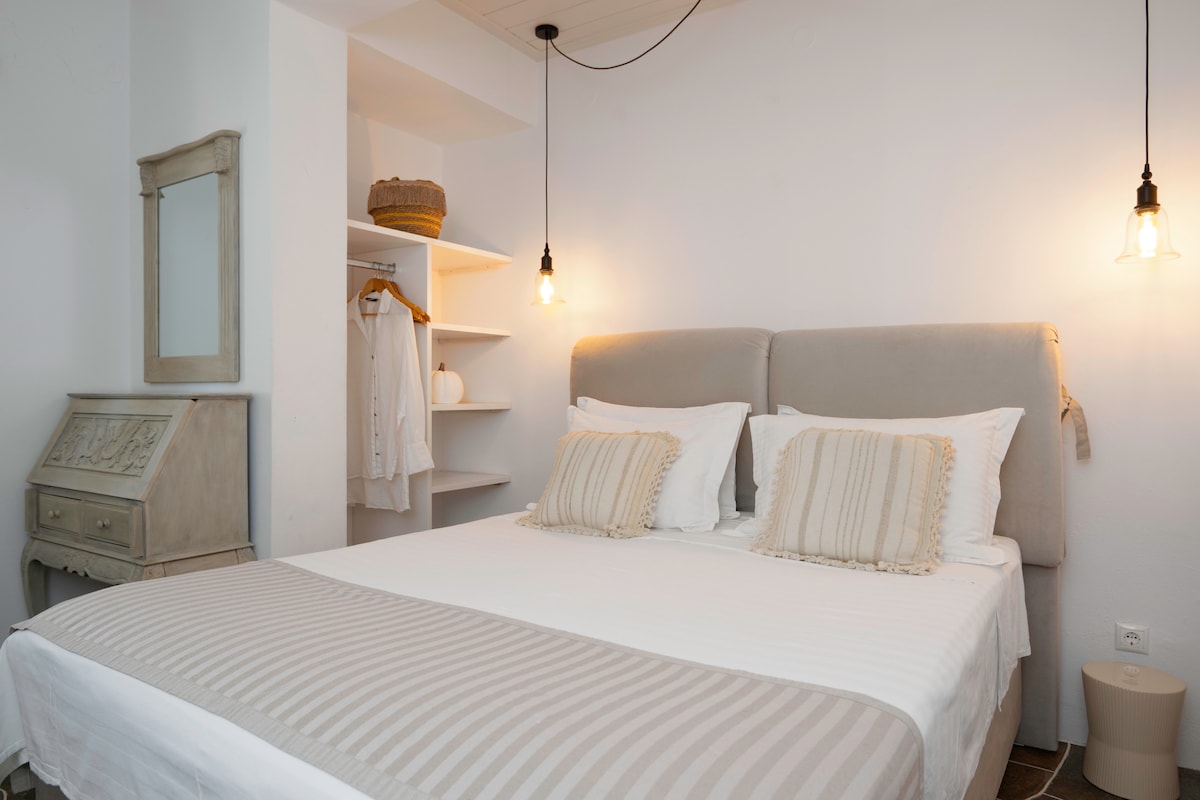 Hringeyskt hús á fyrstu hæð í einu af mest ljósmynduðu og rólegustu hverfunum í miðborg Chora þar sem þú getur notið einkaverandar með eftirminnilegu útsýni yfir þorpið og kirkjurnar í nágrenninu. Í innan við mínútu göngufjarlægð getur þú notið hins fræga næturlífs og veitingastaða ásamt fallegum torgum sem skapa töfrandi andrúmsloft!
