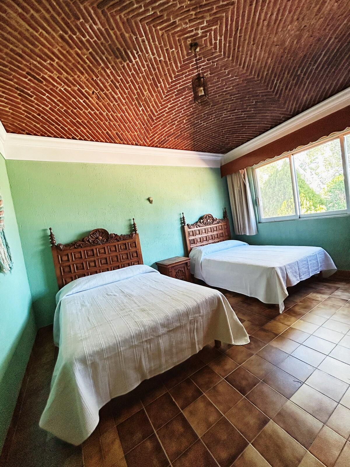 Amplia casa ajardinada, con todas las comodidades para una excelente estancia. La planta baja es de amenidades; cancha de futbol, asador, palapa, baños, regaderas, vestidores, alberca, vapor, temazcal, jardines y acceso para vehículos. En la planta alta encontraras el área de descanso con amplias habitaciones, baños, sala comedor y cocineta completamente equipadas, con una espectacular vista a las áreas verdes que la rodean. Sin ir tan lejos de la ciudad, seguro lo disfrutarás. ¡Te esperamos!