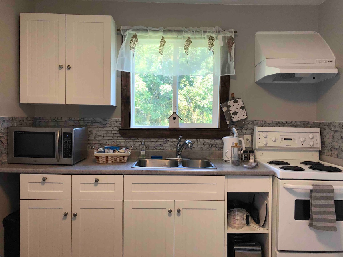 Slakaðu á og slappaðu af í þessu friðsæla og einkarekna gistihúsi sem er staðsett á 25 hektara skógi. Við erum fjölskylduvæn og bjóðum þér að ferðast um landið og heimsækja endur okkar og hænur! Ef þér líður eins og þú sért ævintýragjarn skaltu njóta þess að fara í göngu- eða hjólaferð á einum af mörgum gönguleiðum heimamanna í göngufæri í höfuðborg Kanada! Síðar notalegt upp að viðareldavél eða eldstæði utandyra. Náðu þér í fav-forritin þín með Roku-sjónvarpi eða spilaðu Super Nintendo. Njóttu nýuppgerðu regnsturtunnar.