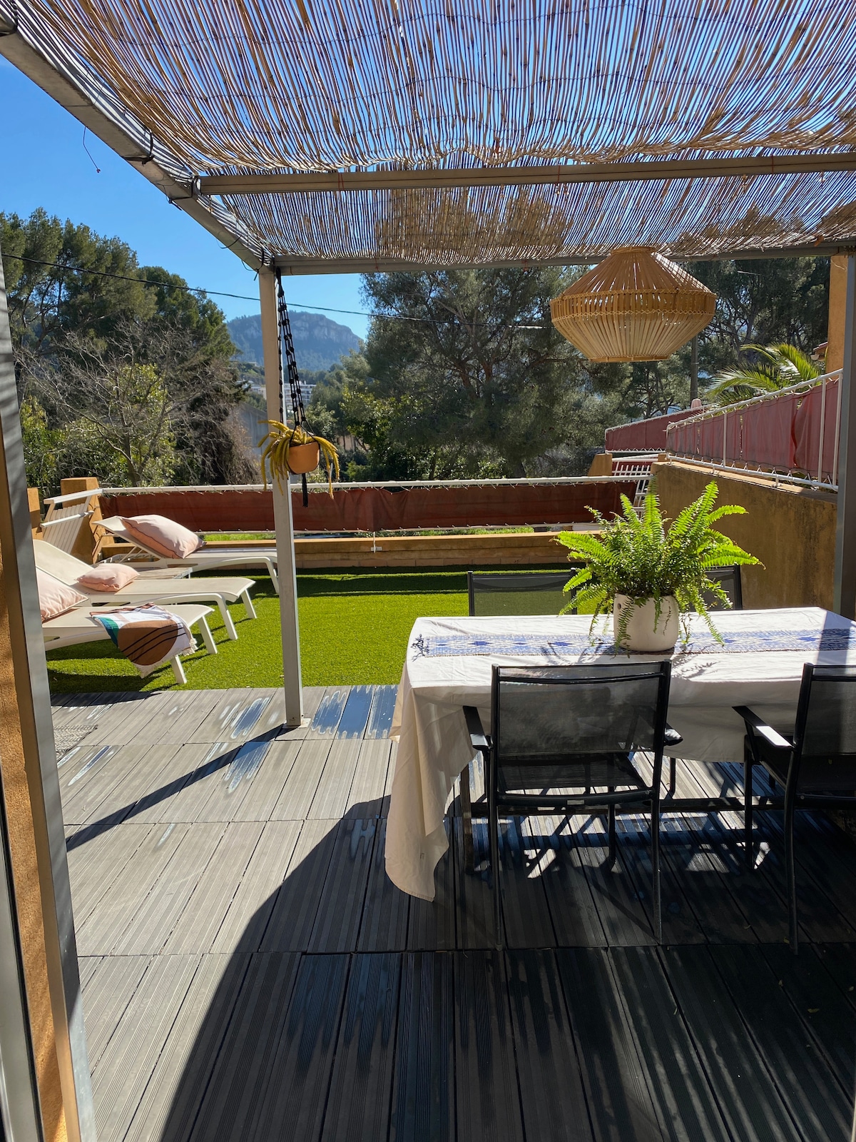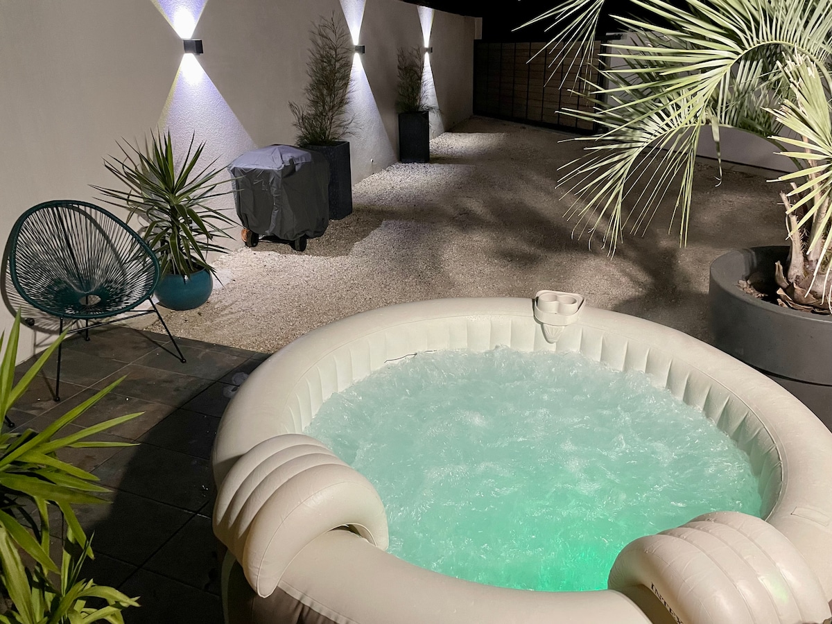 Gistingin með yfirbyggðum einka heitum potti er staðsett í dreifbýli en er nálægt miðborginni, ströndum og verslunum. Það er staðsett neðst í nútímalegri villu í restanque með ólífutrjám, eikum og aldagömlum furu. Þú munt njóta kyrrðarinnar, fuglasöngsins og cicadas á sumrin. Gestir geta lagt bílnum sínum við innréttingin rétt fyrir framan íbúðina þökk sé rafmagnshliðinu með merki. Afslappandi stund tryggð á einkaveröndinni með heilsulind