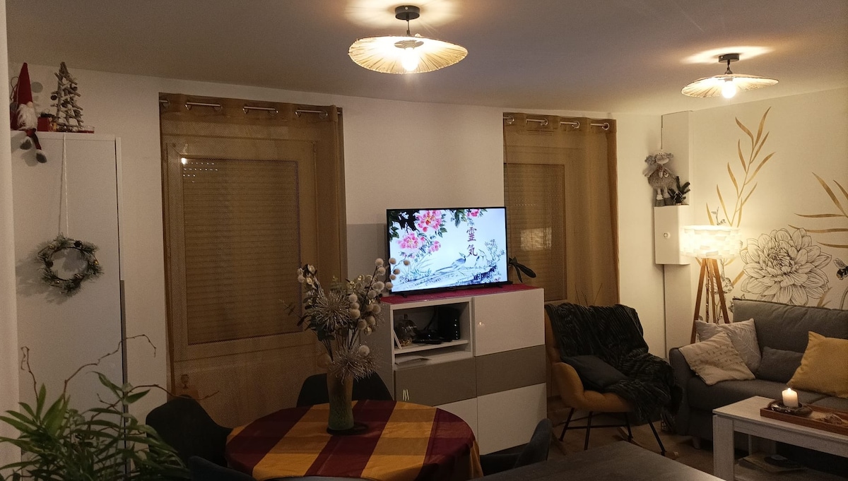 Bedding and towels are provided! A bike storage room is available Welcome to our bright cottage with its rooftop and its view of the forest 500 m from the village, you can take the time to walk through the flowery streets and discover the pictures and the talent of its craftsmen. Please be careful, the stairs are quite steep for an elderly person