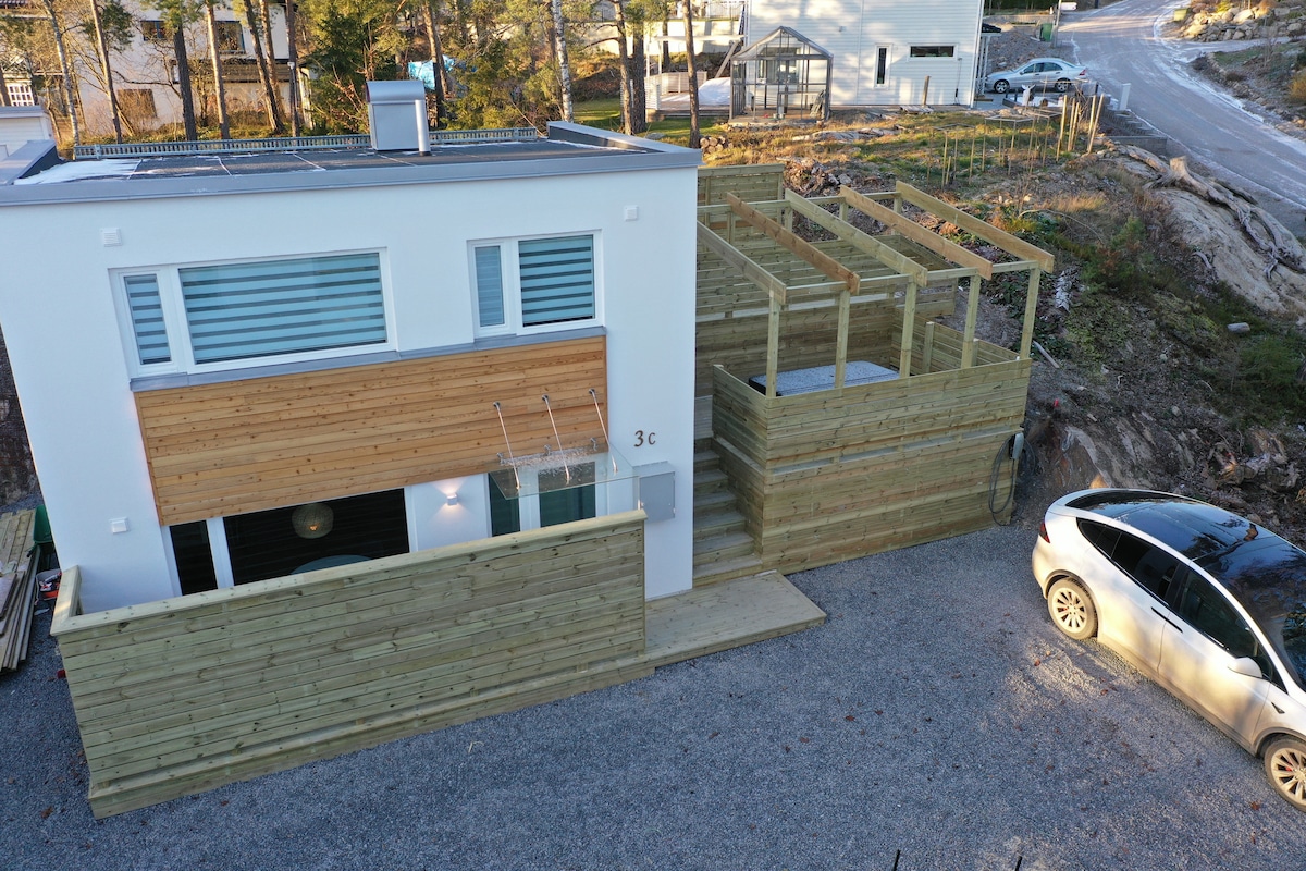 Nýbyggt nútímalegt hús í tveimur mjölum sem eru um 54 fermetrar að stærð fyrir mest 4 manns Inngangur á gólfi: rúmgott baðherbergi með þvottavél og þurrkara, salur með stórum skáp, stofa með eldhúsi(allt sem þú þarft), svefnsófi 130cm x200cm (fyrir 2 persónur). Önnur hæð: Rennihurð út á verönd, hjónarúm í hjónaherbergi 160cm x200cm og eitt svefnherbergi til viðbótar með rúmi 120 cm x 200 cm. Rúmgóð verönd með eigin bílastæði með hleðslutæki fyrir rafbíla Skemmtu þér með allri fjölskyldunni á þessum glæsilega stað.