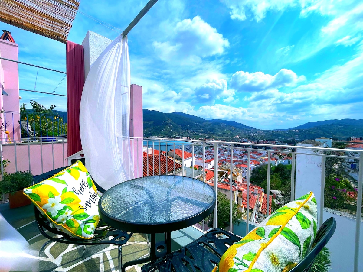 Slakaðu á í svítunni okkar í forna og hefðbundnasta hverfinu í Skopelos á svæði Krists!!Hér heyrir þú aðeins hljóð heimamanna þar sem það eru engin farartæki!!Aðgangur er frá Mylos þar sem er laust pláss til að leggja!!Þaðan förum við mjög lítið niður. Önnur gata nálægt miðjunni er einnig brunnurinn!!!Við erum í hjarta gamla landsins!! Það gleður þig að ruslinu er safnað með hesti !!