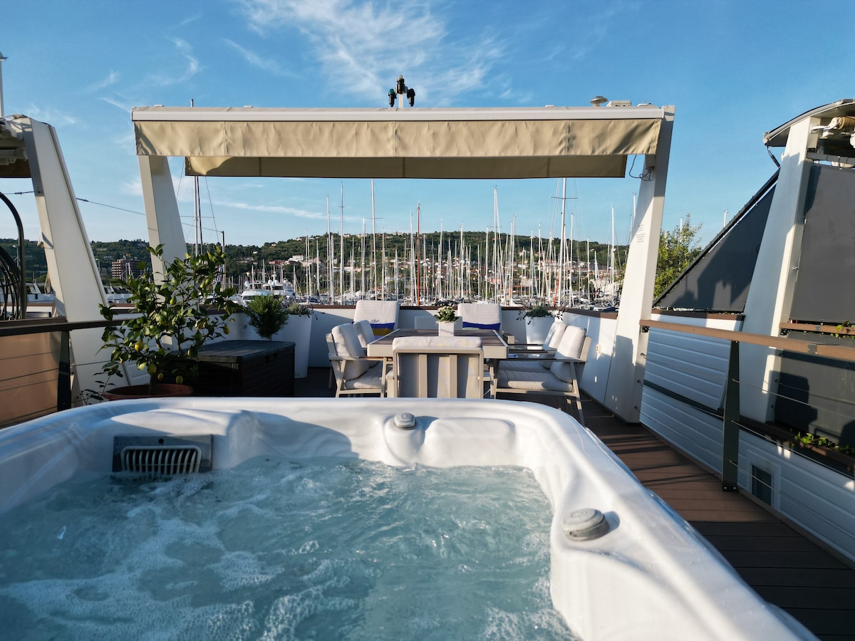 Experience luxurious life on water. Clean, fresh, nice views, good location, lovely baths in both jacuzzi and sea, luxurious living. Our moden designed Floating Sea house Vital Lux is located in one of the most beautiful marinas in Slovenia, offering services such as swimming pool, chldren playground, restaurants... Welcome on board!