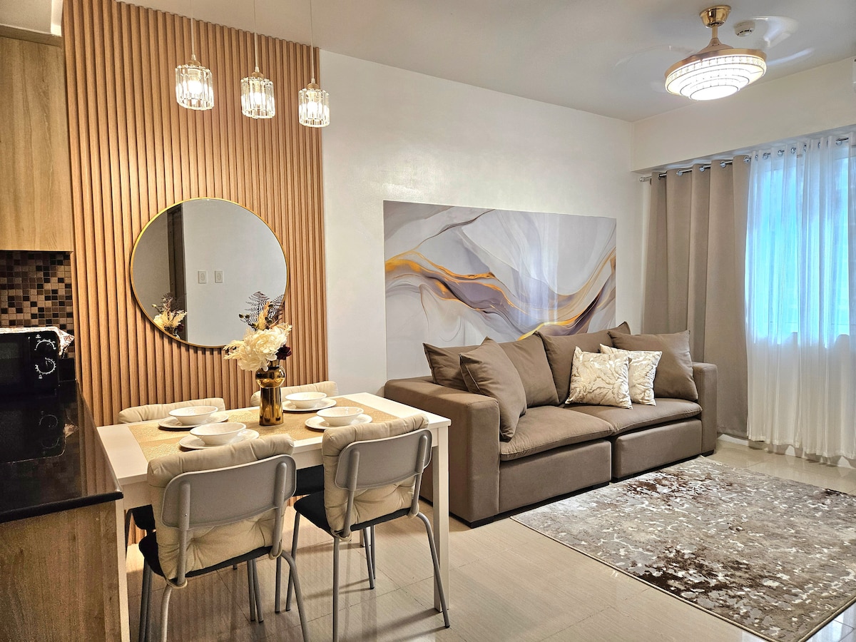 Bókaðu þessa lúxusgistingu í miðborg BGC. Allt er í aðeins nokkurra skrefa fjarlægð. Prime offices and high end malls around Uptown Parksuites. Upplifðu heimsborgaralegt frí í Uptown Mall. Kynnstu einstökum hugmyndum um mat og verslanir. Skemmtu þér á bestu börunum við dyrnar hjá þér. Slappaðu af í nútímalegu svefnherbergiseiningunni okkar frá miðri síðustu öld. Meðal þæginda eru 55 tommu SNJALLSJÓNVARP, 400 MB/S internet og rannsóknarsvæði. Njóttu þægilegrar og stílhreinnar upplifunar á þessum miðlæga stað.