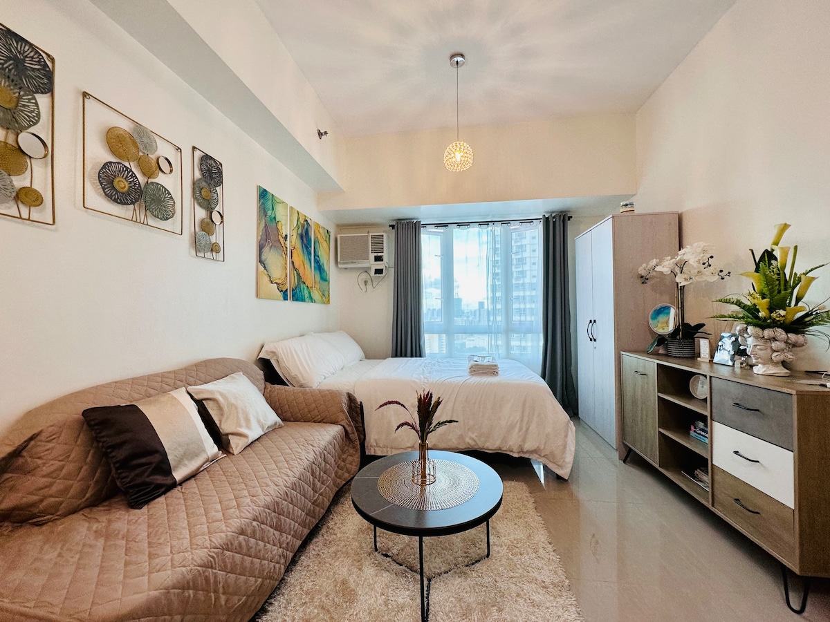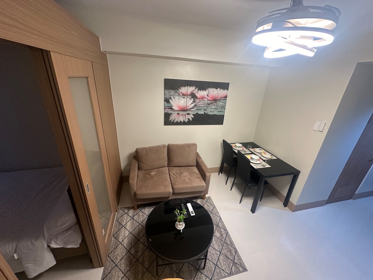 Íbúð með einu svefnherbergi í BGC,vel viðhaldið og þrifið. ÓTAKMARKAÐ ÞRÁÐLAUST NET OG HBO er TILBÚIÐ!!! Innréttingar láta þér líða vel. Eldhúsið er fullbúið með fullkomnum eldunaráhöldum. Þvottavél/þurrkari er einnig til staðar í eigninni Það er staðsett við One Uptown Residence hinum megin við VERSLUNARMIÐSTÖÐINA Uptown Mall og svefnherbergi er fyrir framan Grand Hyatt. Staðurinn er nálægt Makati Central Business District og Ortigas Center. Flugvöllurinn er í um 30 mínútna akstursfjarlægð(fer eftir umferðaraðstæðum).