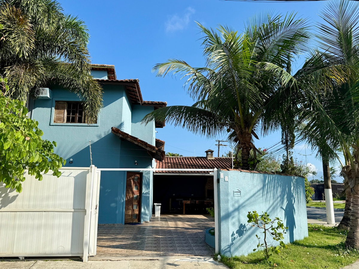 Hús í Bertioga, stórt með 3 svefnherbergjum með loftviftu, 2 baðherbergjum, stórri stofu með opnum sjónvarpsrásum, þráðlausu neti, eldhúsi með áhöldum, þar á meðal örbylgjuofni og grilli í bílskúrnum. Hún rúmar allt að 11 manns, þar af sofa tveir í stofunni. Bílskúr fyrir þrjá bíla. Ég bý í lítilli byggingu aftan við húsið. 20% afsláttur þegar þú leigir í heila viku. Láttu gestgjafann vita fyrir fram ef þú kemur með gæludýr.