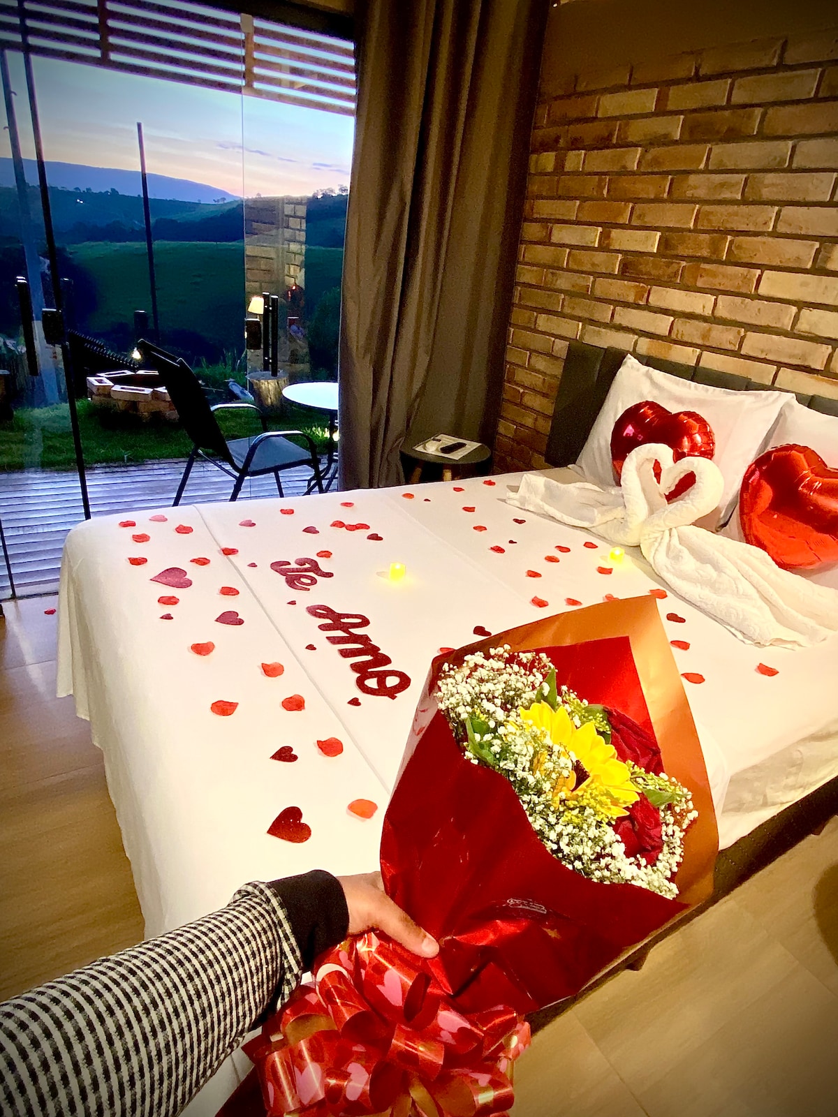 Refúgio romântico em meio à natureza, ideal para casais. Chalé estilo suíço (A-frame) em sítio cercado por cafezais, com rio e cachoeira particulares. Possui banheiras externas com vista para a Serra da Mantiqueira, jacuzzi interna, fogueira, churrasqueira, quadra de beach tênis, cama-balanço, sauna seca com vista e projetor interno com telão de 100”.