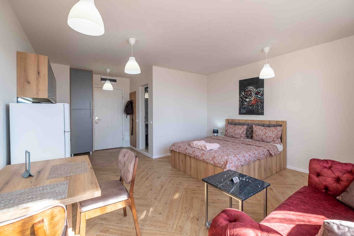 Heil einnar herbergis íbúð staðsett í nútímalegri byggingu. Loftkæling. Gólfhiti á veturna fyrir framúrskarandi þægindi. Rúmgott og nútímalegt baðherbergi. Bein tenging við flugvöllinn með neðanjarðarlest og síðan 8-10 mín. ganga beint eða 1 stoppistöð með sporvagninum. Bein tenging við Central Bus/Railway Station. Miðborgin er í göngufæri eða 12 mín. með almenningssamgöngum ef þú vilt það frekar. Sporvagninn/strætóstoppistöðin er fyrir framan húsið. Nærri verslunarmiðstöðinni í Sófíu og heilsulind/sundlaug. Matvöruverslun.