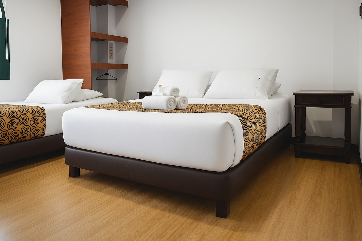 Nútímalegt 1 svefnherbergi hótelherbergi og baðherbergi sem hægt er að leigja. Staðsett á Avenida de las Américas. The Room includes breakfast , Flat Screen TV With Netflix, High Speed Internet, Parqueadero next to the building.