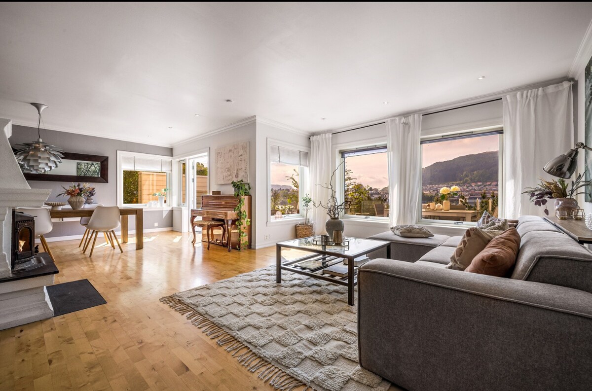 Þessi glæsilegi gististaður er tilvalinn fyrir hópferðir, fjölskyldur, pör eða fyrir fólk sem er í viðskiptaerindum. er með 3 góð svefnherbergi með þægilegum hjónarúmum. Húsið hefur verið endurnýjað að fullu árið 2020 og búið snjallheimili með fjarstýrðri lýsingu og upphitun. Húsið er staðsett á rólegu svæði með mögnuðu útsýni. það er stutt í Aksla og 2 km að stofunni í fjallinu (útsýnisstaður borgarinnar). Strætisvagnastöð er beint fyrir framan húsið með tíðar brottfarir.