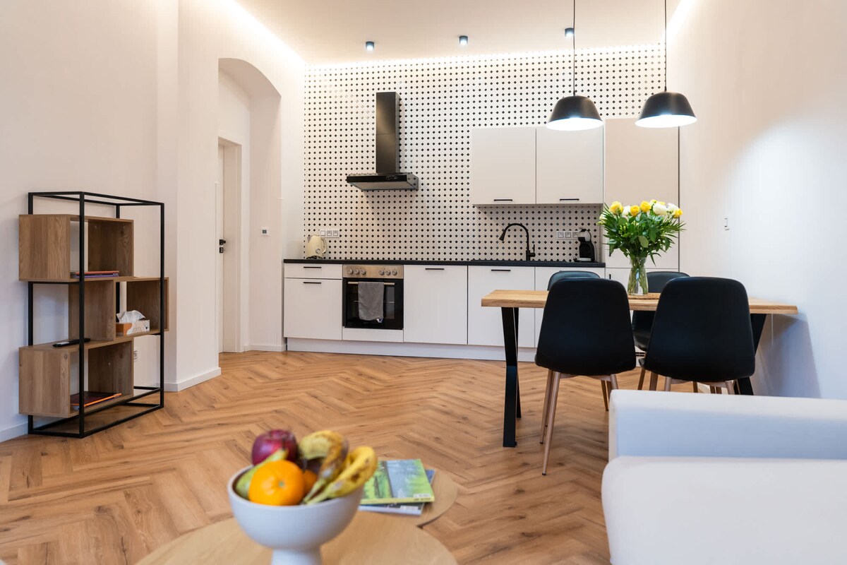 Stílhrein, nýuppgerð íbúð hönnuð fyrir fjarvinnu og djúpa hvíld. Staðsett í sögulegri byggingu í hjarta Karlovy Vary, heillandi heilsulindarbæjar á heimsminjaskrá UNESCO. Njóttu tveggja hljóðlátra vinnustöðva með hæðarstillanlegum skrifborðum og ofurhröðu þráðlausu neti, hvort um sig í aðskildu herbergi til að einbeita sér. Hugulsamleg atriði eins og lífefld lýsing styðja við náttúrulegan takt en rúm af bestu gerð með yfirdýnu tryggir endurnærandi svefn. Þú ert ekki bara í heimsókn heldur ertu komin/n heim. Þægilegt og notalegt.