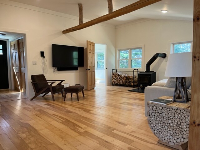 Renovated circa 1920 carriage house in a quaint New England college town. Eight-minute walk to busy downtown with restaurants, bars, shops, and grocery store. Elegant contemporary style. Open concept downstairs with sofa, daybed (napping in the sun!), and chef-designed kitchen. Second level with two queen beds and small balcony. Adjoins miles of walking trails and forest, full of wildlife. Less than 5-minute drive to a 1.5 mile running trail along the Sandy River, with refreshing swimming.