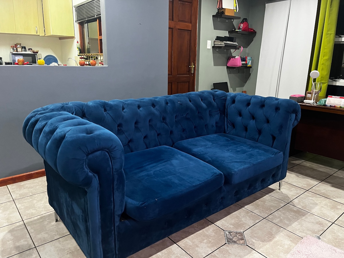 Þessi fallega hönnuða tveggja svefnherbergja íbúð er staðsett á eftirsóttasta staðnum í Stellenbosch og blandar saman nútímalegri þægindum og klassískum sjarma. Opið stofusvæðið er bjart og hlýlegt með djarfu blómamyndum á veggjum, ríkri áferð og þægilegri stofu sem opnast út á einkasvölum. Hagnýtt eldhús með gaskoktepli, ofni, örbylgjuofni, Nespresso-vél og innbyggðum ísskáp — allt sem þarf til að sjá um sig sjálfur.