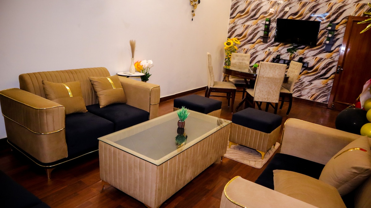 Verið velkomin í Royale Aura, nútímalegan griðastað sem blandar saman þægindum og stíl. Þessi notalegi dvalarstaður er með nútímalegum hönnunarþáttum sem skapa notalegt rými sem er fullkomið fyrir afslöppun og framleiðni. Hvort sem þú slappar af eftir langan dag eða tekur á móti fjölskyldu eða vinum. Royale Aura býður upp á fullkominn bakgrunn fyrir hvert augnablik. Njóttu snurðulausrar samruna virkni og fagurfræði í þessu einstaklega heillandi húsnæði.