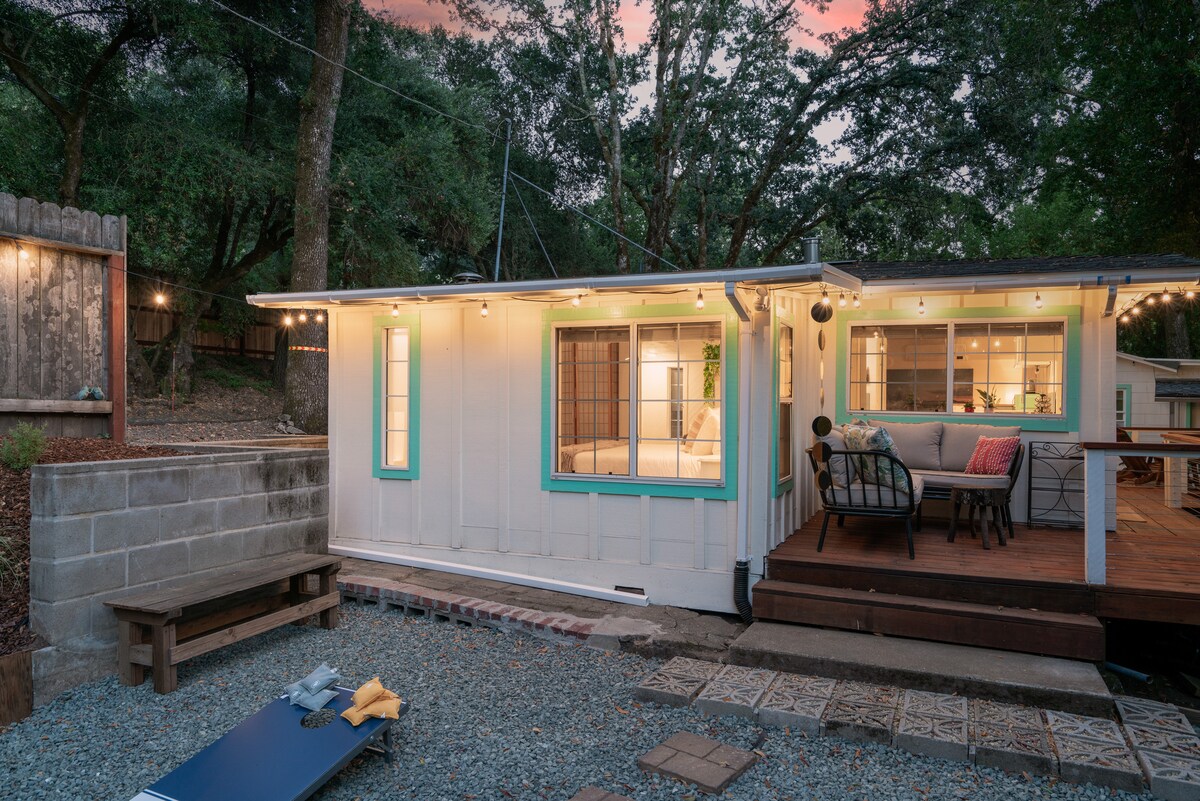 Settu upp brenndan svifdisk og komdu þér fyrir með bók á veröndinni á meðan grillið hitnar. Þetta sólbjarta afdrep er fyrir ofan bílskúr í rólegu og gönguvænu hverfi og býður upp á afslappað og fágað andrúmsloft. Skoðaðu allt það sem Sebastopol hefur upp á að bjóða á: visitsebastopolnow.come Þetta annað hús er mjög eftirsóknarvert rými, staðsett nálægt bænum, enn að vera sett á mjög fallegri götu í vinalegu og rótgrónu eldra hverfi. Það er staðsett á milli annarra mannvirkja á lóðinni. Eitt af því að vera „Tiny House“ sem er rétt hjá, heimili mitt situr fyrir aftan íbúðina. Í húsinu er fullbúið eldhús með öllum áhöldum og nauðsynlegum eldunarbúnaði, pottum og pönnum o.s.frv. Stór brauðristarofn sem passar meira að segja fyrir frosnu pizzuna þína. Það er pláss fyrir framan með nokkrum Adirondack-stólum og grilli ef þú vilt slaka á úti. Húsið er með sérinngang við innkeyrsluna. Húsið mitt er aftast í íbúðinni, ég gæti séð þig eða ekki, en ég er til taks fyrir einhverjar spurningar hvenær sem er. Hvíti kötturinn okkar tekur á móti þér með appelsínugulum ábendingum (sem heitir White Boy). Ef hann fær tækifæri mun Charlie okkar mjög yfirþyrmandi Golden Doodle taka vel á móti þér. Þetta svæði er staðsett í aðeins 1 mílu fjarlægð frá hjarta sæta bæjarins Sebastopol. Það er hentugur staður til að fara út fyrir vínekrur, fallegar strendur, verslanir og veitingastaði við strandrisafuru. Mjög góð mílu gangur í bæinn eða í fimm mínútna akstursfjarlægð. Það er stigaflug sem þú klifrar til að komast að flatarrýminu, það er ekki með hjólastólaaðgengi. Það eru kettir á staðnum en þeir fara ekki inn í íbúðina. Goldendoodle okkar er mjög vingjarnlegur. Leðursófinn leggst flatur saman í hjónarúm til að taka á móti tveimur gestum til viðbótar. Aðgangur að baðherberginu er hins vegar í gegnum svefnherbergið. Það er engin sérstök bílastæði, en götubílastæði beint á móti íbúðinni, bara upp frá, en ekki fyrir framan póstkassana þrjá er yfirleitt alltaf opið.