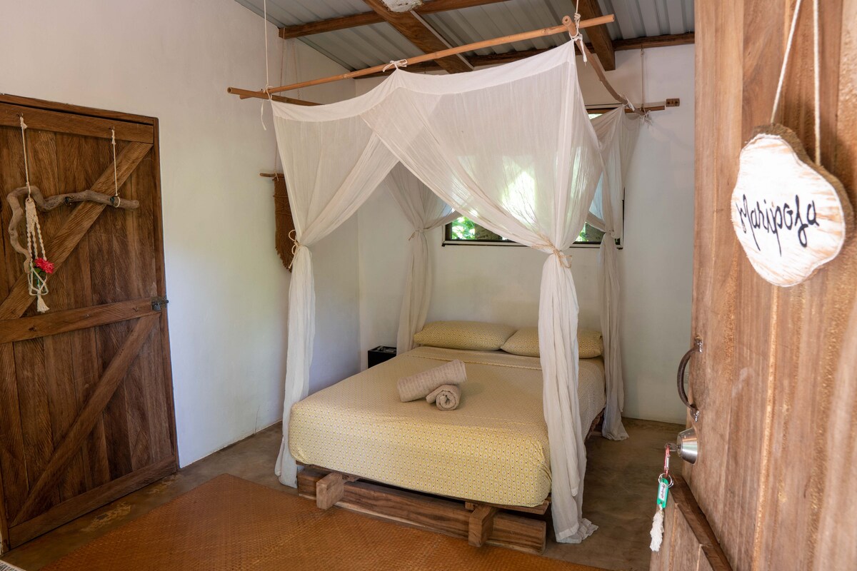 Í fyrsta lagi viljum við nefna greinilega að gistiaðstaðan okkar er mjög einföld. Enginn lúxus, þú nýtur mjög EINFALDS LÍFS með okkur á brimbrettinu. HERBERGI MARIPOSA. Svefnherbergi með útsýni yfir græna náttúru, fullt af hitabeltisplöntum og sameiginlegum palli með sameiginlegu baðherbergi og eldhúsi. Herbergið er með hjónarúmi, moskítóneti, koddum, viftu og rafmagnspunkti. Útivistarsvæðið er útbúið með hengirúmum til afslöppunar og afslöppunar.