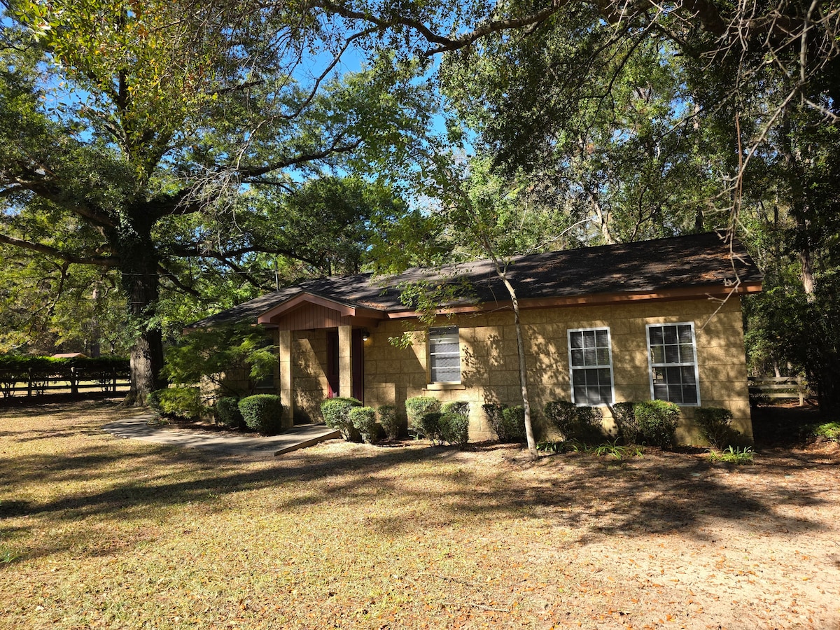 Come feel the magic of our renovated country guest house. It's a 2 bedroom, 2 bathroom, with a full kitchen, dining & living room. The master bedroom has a king bed and the 2nd bedroom sleeps 3 with a twin XL bunk bed and a separate twin XL bed. The master bath has a luxurious walk-in curbless shower & double vanity. The house is down a private drive after going through a security gate. Guests have use of our private in-ground pool (pools open) BBQ, fire pit, 40 acres, and 2 fishing ponds.