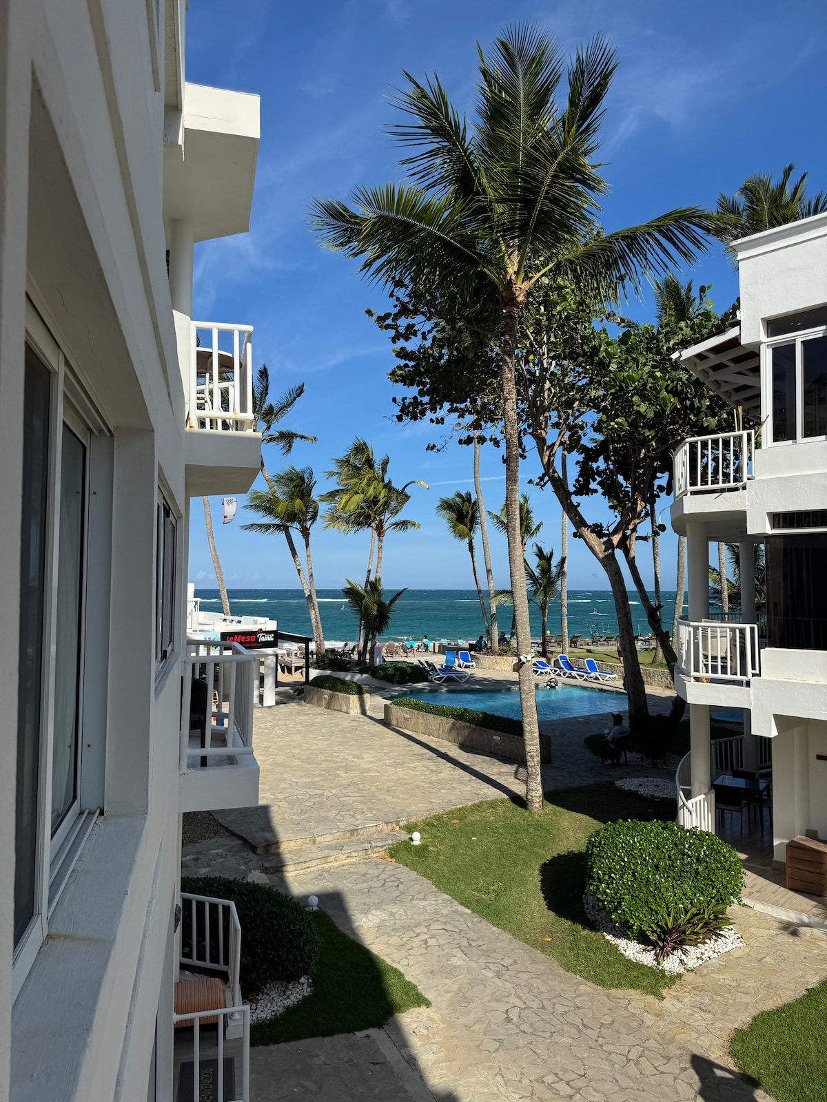 Fullbúin íbúð er í lúxushúsnæði við fyrstu línu í miðborg Sosua. Komið er inn á 3. hæð og útsýni yfir garðinn. Íbúðin er með öryggi allan sólarhringinn og rafmagn allan sólarhringinn. Á svæði íbúðarinnar eru tvær sundlaugar, barnasundlaug, djákni, grillaðstaða, veitingastaður og hársnyrtistofa. Búin strönd með sólstofum, sturtu, salerni (allt ókeypis). Einstaklingsbundið háhraðaþráðlaust net er í íbúðinni en viðbótargjald er fyrir rafmagn.