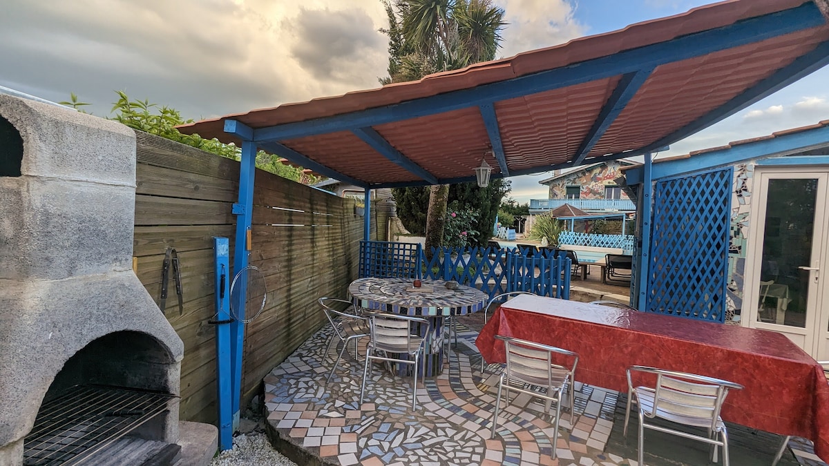 Cozy 4-bedroom cottage within the Maison Mosaic property, featuring 2 double beds and 4 single beds — perfect for families or groups. Guests enjoy access to the pool, private parking, and large garden. The cottage includes a private terrace, BBQ area, indoor and outdoor dining spaces, and a fully equipped kitchen. - Ocean is 15 min away - Chateaux for wine tasting are all around the area. - each cottage has private indoor and outdoor dining area - Resto/Supermarkets 5 min by car