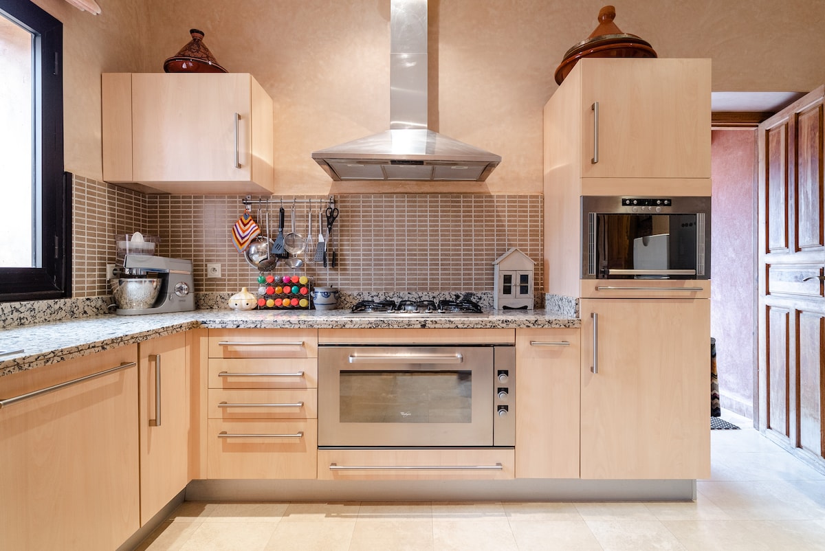 Hafa tímalausa reynslu í þessu stórkostlega hefðbundna marokkóska húsi með sundlauginni og einkagarði. Tilvalið fyrir fjölskyldu eða vini, það mun leyfa þér að slaka á í glæsilegu og fáguðu umhverfi. Það var byggt árið 2010 af þekktum arkitekt í Marrakech. Einkagarður sem er 650m2 og fallegur Orchard sem er 3000m2 Verönd - Þak með útsýni yfir Atlas Mjög stór útsýnislaug 14 x 6m sem ekki er horft framhjá. netflix er með net- og gervihnattasjónvarpi.
