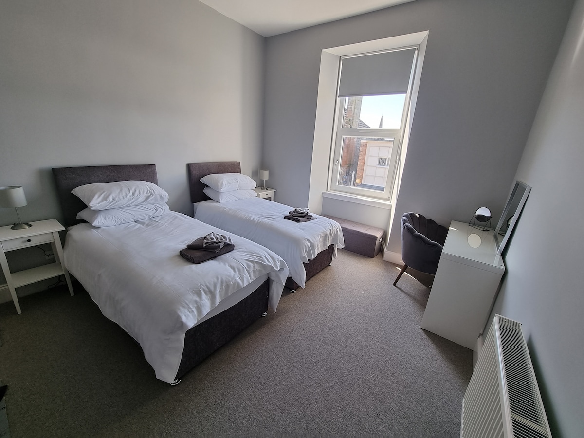 Hægt er að setja öll herbergi upp sem tveggja manna eða ofurkóngastærð. Vinsamlegast óskaðu eftir því hvaða stillingar þú þarft við bókun. 3 bedroom, 2 shower room apartment in center of Troon in pristine condition, Minutes walk from all restaurants, cafes bar 's and shops. Lestarstöð í 2 mínútna göngufjarlægð. Við erum einnig með 2 systuríbúðir „sjávarútsýni“. 3 svefnherbergi/2 baðherbergi með sjávarútsýni og Aparment@No2 3bed/3bath. Sjá meira á Airbnb skráningu.