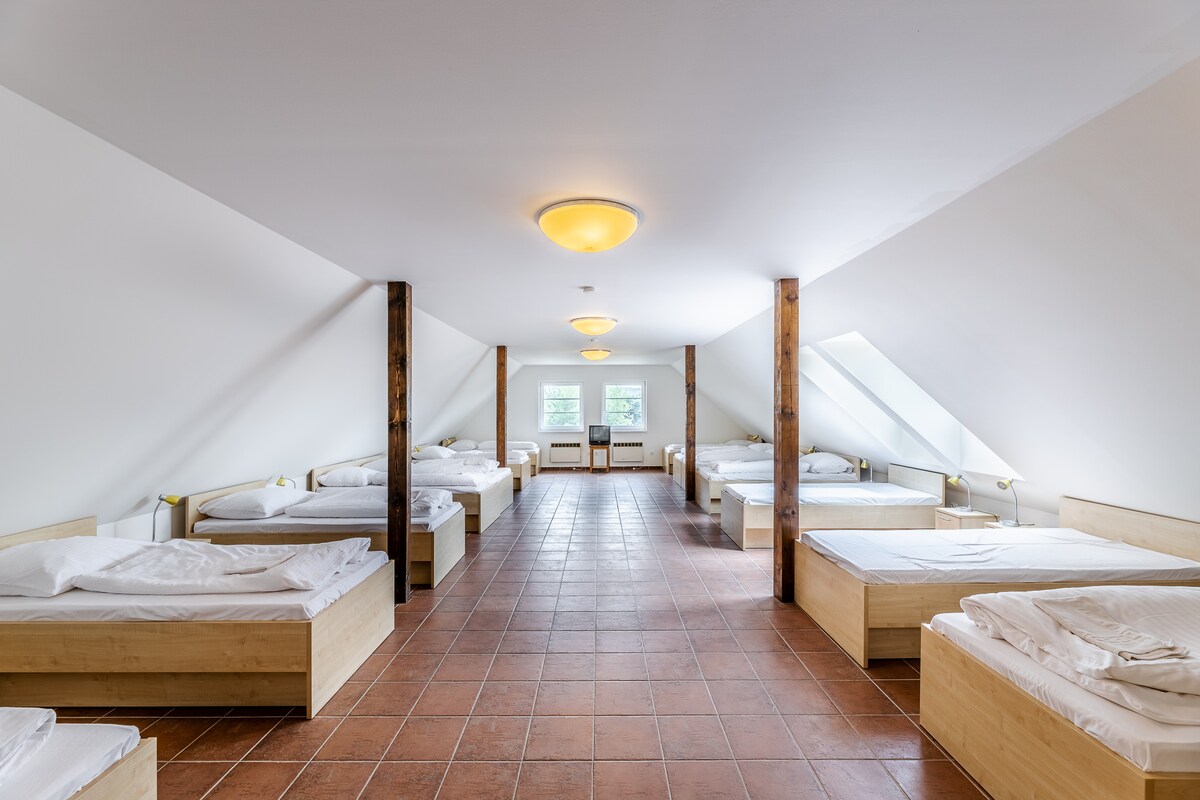 ATHUGIÐ: Þú verður að hafa eigin svefnpoka eða teppi, sem og handklæði!!! Gistu í læsanlegu herbergi í 120 fermetra vinnuaðstöðu á háalofti húss í miðbæ Jihlava. Einstakt rými þar sem þú getur einnig notað óhefðbundinn búnað eins og borðfótbolta eða rafstillanleg skrifstofuborð, hljóðeinangruð og fundarherbergi... Þessi einstaka gisting er nálægt alls staðar svo að skipuleggja heimsókn verður gola fyrir þig.