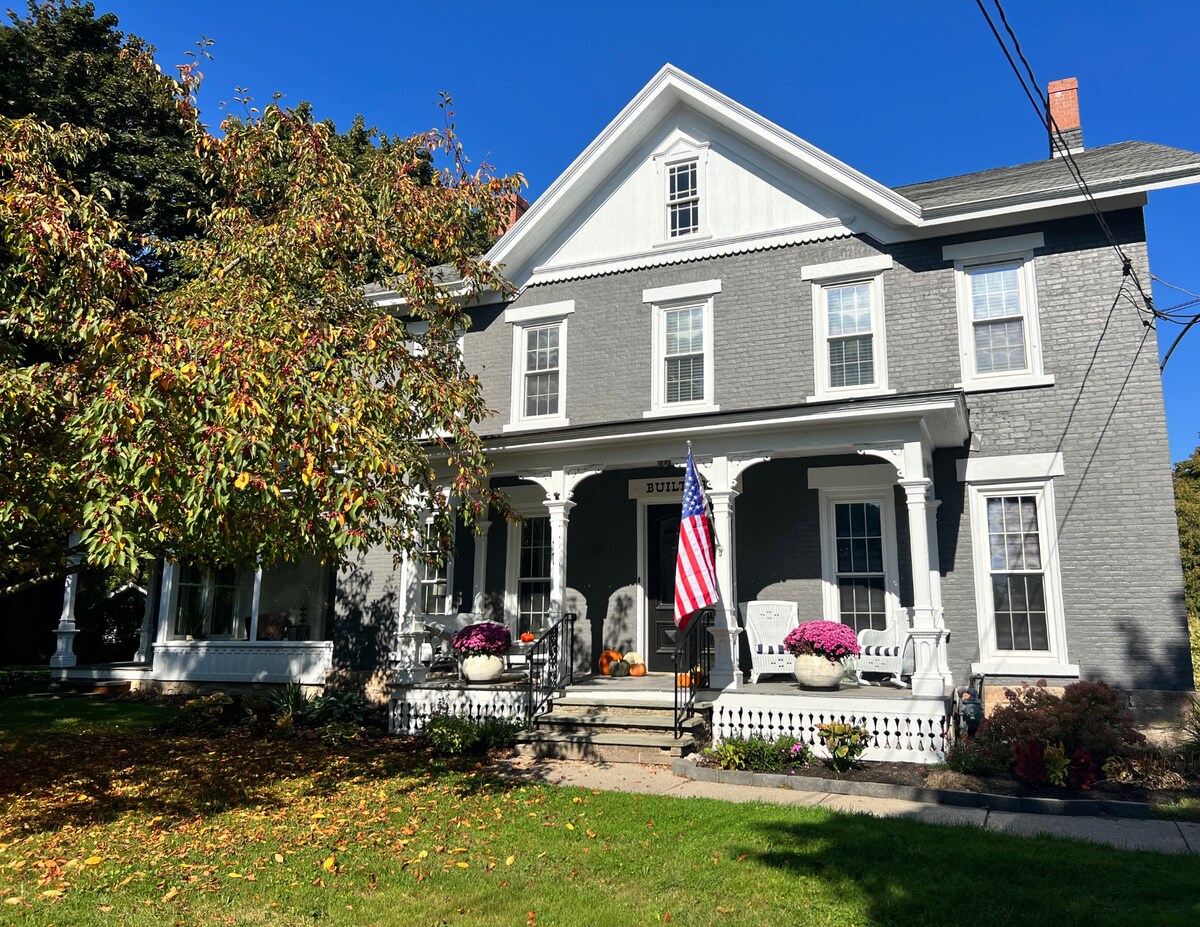 Country staðsetning á rólegum vegi aðeins nokkrar mínútur frá Canandaigua Lake, og Bristol Mountain. Stórt bóndabýli með einkasvítu, þar á meðal risastórt frábært herbergi (450 sf), vefja um veröndina. Vinsamlegast athugið að svefnherbergi og bað eru uppi. Jarðhitun/kæling. Enginn fullbúið eldhús eða vaskur á neðri hæð í boði, aðeins brauðristarofn, lítill ísskápur, kaffivél (Keurig) með sætum fyrir 4 í hluta af frábæru herbergi. Sjónvarp, hratt þráðlaust net fyrir öll tækin þín. Nóg næði og pláss til að dreifa úr sér.