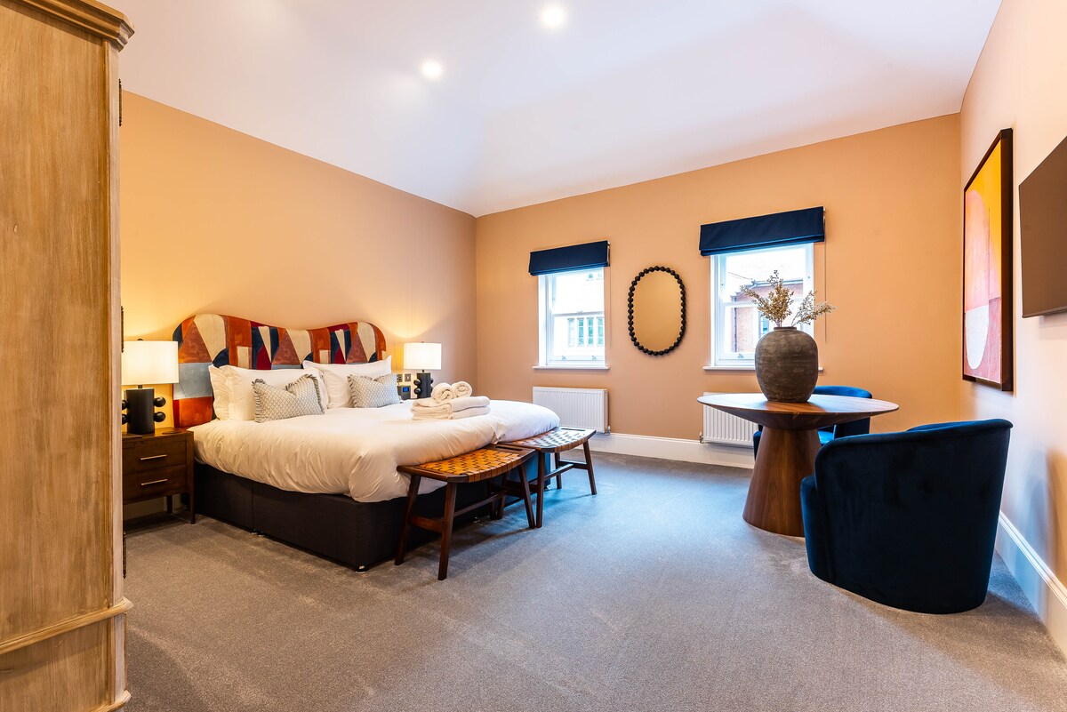 Þetta friðsæla svefnherbergi gefur þér tækifæri til að hlaða batteríin. Þú finnur íburðarmikið king-rúm, skrifborðspláss ef þú þarft að ná þér í vinnu, hægindastól, fataskáp og fallegt ensuite. Fullbúið með ókeypis þráðlausu neti, snjallsjónvarpi, DAB-útvarpi, te- og kaffiaðstöðu og hárþurrku. Í baðherberginu er öflug sturta til að þvo daginn í burtu og allt er til reiðu fyrir þægilegan svefn.