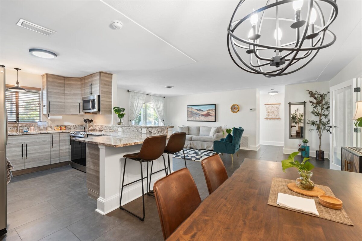 Ben's Bungalow snýst um þægindi og þægindi. Eignin er aðeins 5 km (8 mínútna akstur) frá Siesta Key-ströndinni og hún er fullkominn miðpunktur fyrir næsta ævintýri þitt í Sarasota. Hún lofar ógleymanlegu afdrep fyrir þig og fólkið þitt. Í stóra 3. svefnherberginu er mjög þægileg Nectar dýna og 65 tommu háskerpusjónvarp. Njóttu gígabít-þráðlausa netsins og bakgarðsins sem er búinn nýjum eldiviði, marshmallow-pinnum og girðingu til að tryggja næðið svo að þú getir skapað frábærar minningar með fjölskyldunni.