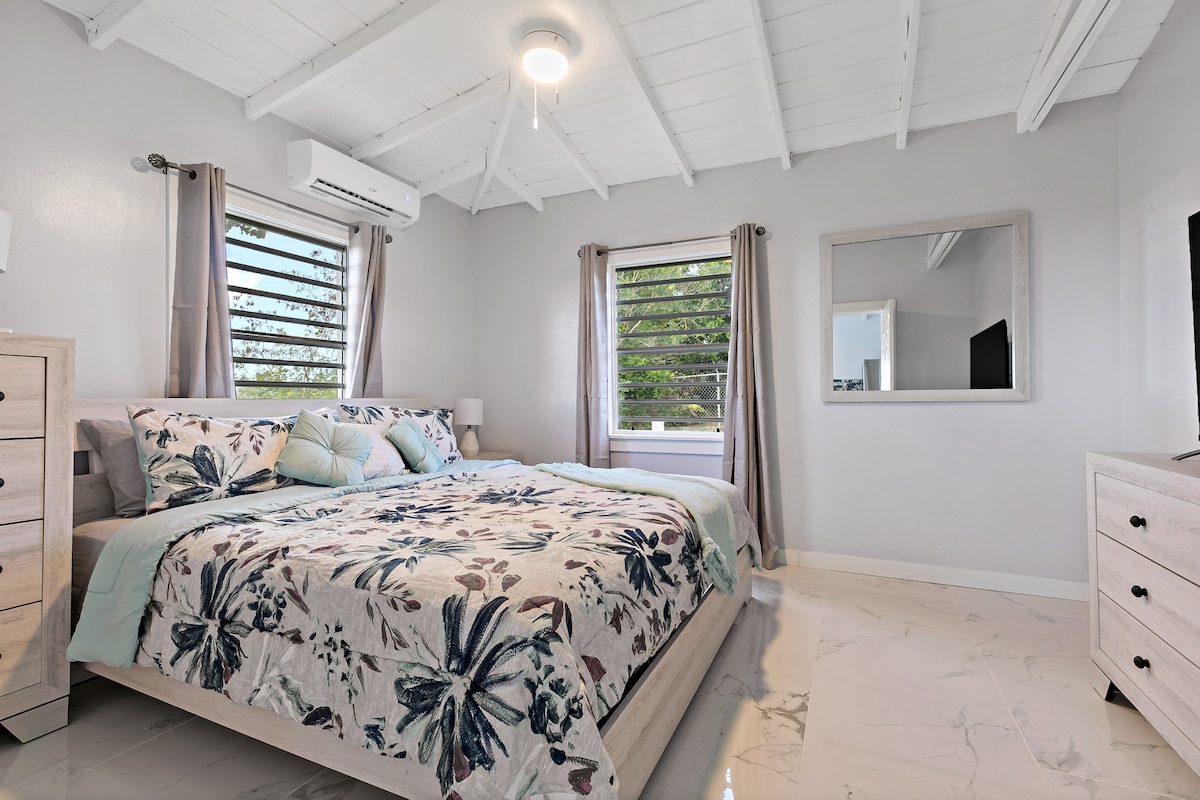 Njóttu glænýrs og glæsilegs bústaðar með mögnuðu útsýni! Miðsvæðis með loftkælingu, þráðlausu neti, sundlaug og rafal. Það eru minna en 8 mínútur á ströndina, 2 mínútur í helstu matvörur, 10 mínútur í veitingastaði og miðbæ Christiansted. Einkainnkeyrsla og bílastæði er á staðnum. Fyrir einhvern nýjan til eyjarinnar er þetta frábær staður til að komast á mismunandi staði og nauðsynjar. Bústaðurinn er í rólegu hverfi með miklu útisvæði og glænýrri sundlaug með útsýni yfir suðurströndina.