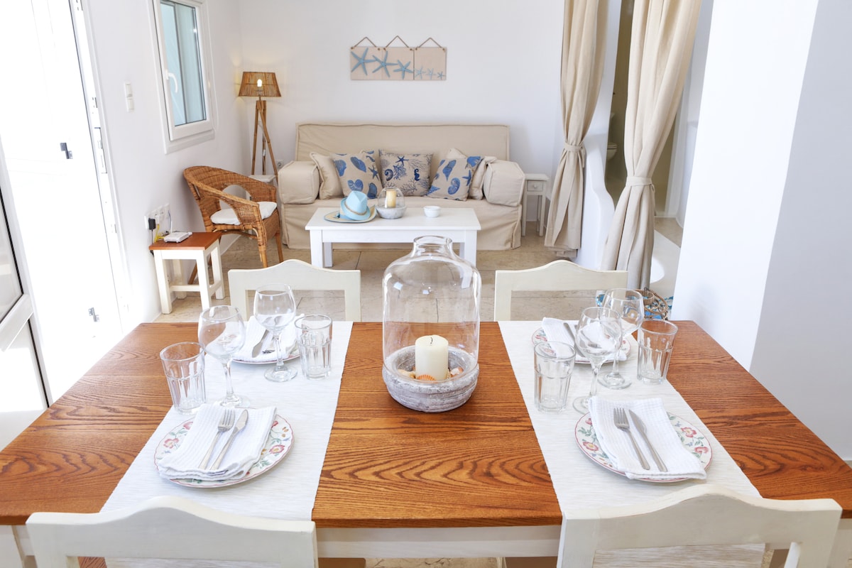 Íbúðin okkar var byggð með tilliti til hringeyskrar, hefðbundinnar byggingarlistar og lágmarks fagurfræði. Íbúðin hentar fyrir 3 til 4 manns! Við erum staðsett í Triovasalos-þorpi þar sem næstu strendur eru Fyropotamos, Plathiena og Sarakiniko. Plaka, höfuðborg eyjunnar, er aðeins í 800 metra fjarlægð. Fótgangandi getur þú einnig náð til Tripiti-þorpsins, forna rómverska leikhússins, Catacombes og fiskiþorpanna Klima og Mandrakia.