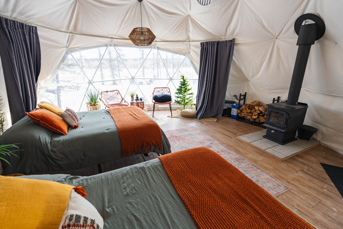 The Wheatgrass Dome is a tranquil haven that embraces the calm of the prairie. Stílfærð í kremum og brúnum með boho-innblæstri og stuðlar að notalegu og skapandi andrúmslofti. Þetta hvelfishús er innréttað með queen-rúmi, þægilegum sætum fyrir afslöppun og litlu borði fyrir leiki eða léttar máltíðir. Með hitara, ljósum og hleðslutæki fyrir síma býður Wheatgrass Dome upp á öll þægindi nútímalegs lífs í kyrrlátu umhverfi sem er innblásið af náttúrunni.