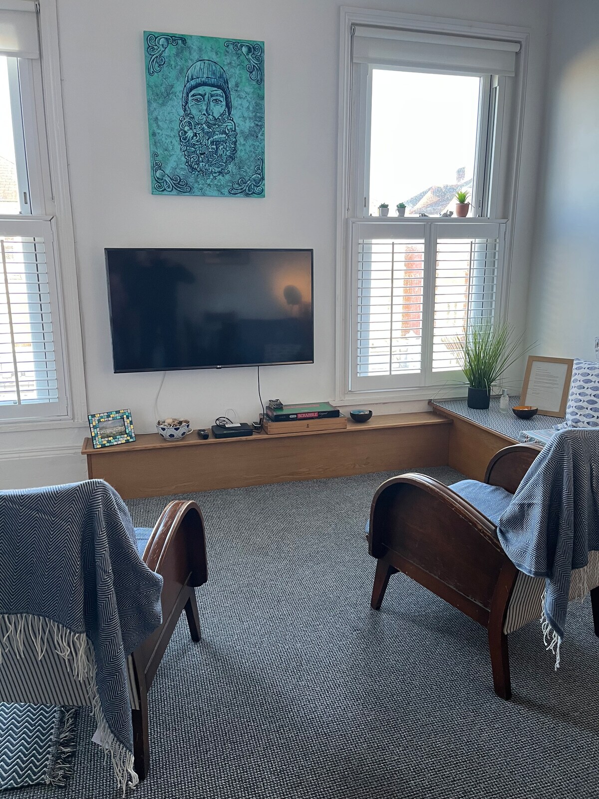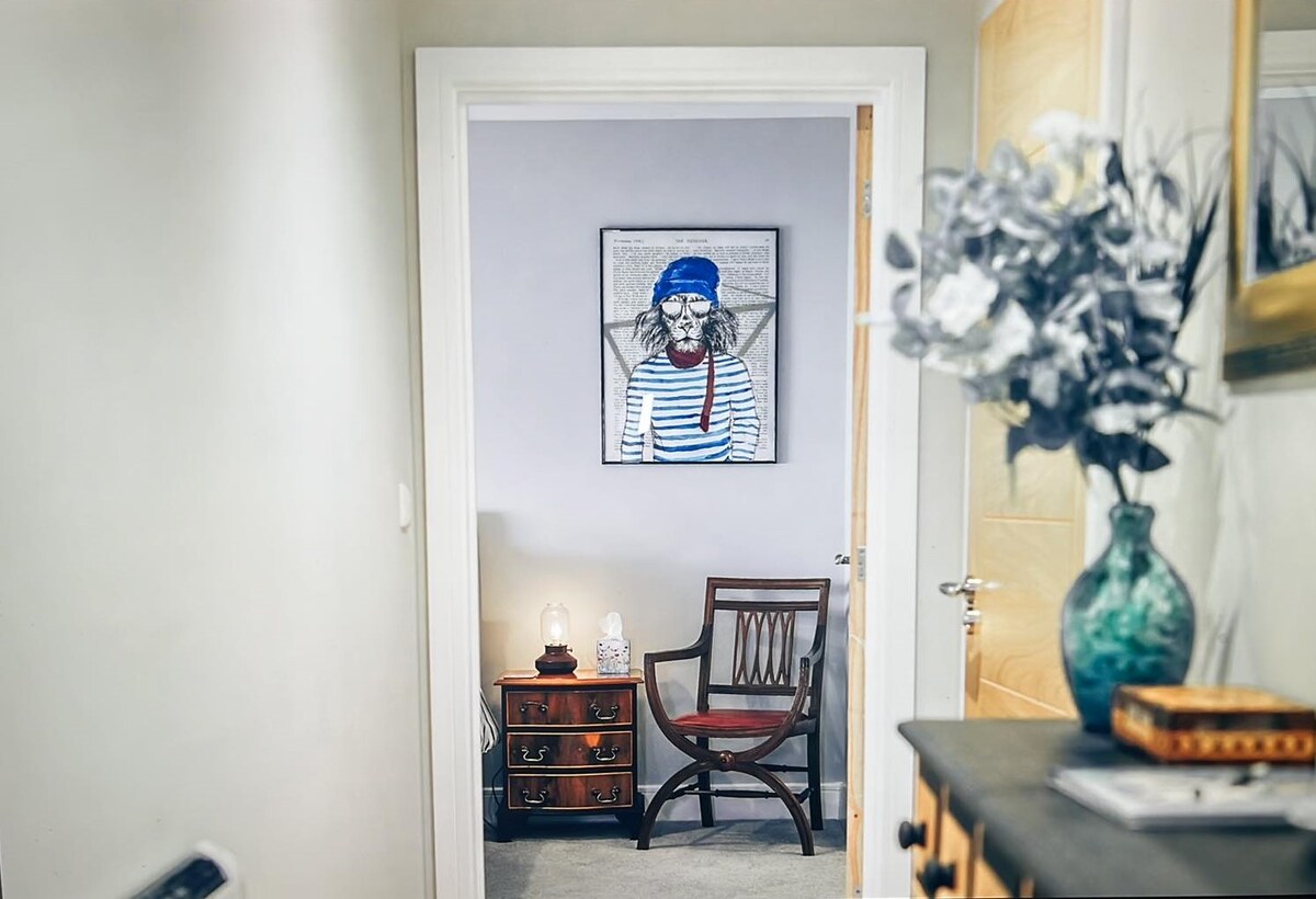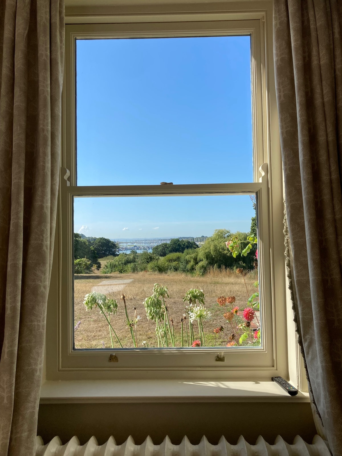 Rúmgóð íbúð með tímabilseiginleikum. Yndisleg setustofa með 2 sófa, flóagluggi með sjávarútsýni. 55" Sky Glass sjónvarp, stórt svefnherbergi með rólegu útsýni að aftan. Tvöfalt rúm og 1 brjóta upp rúm með réttri dýnu í boði. Baðherbergi með kraftsturtu yfir baði. Björt eldhús með tvöföldum hurðum út á upphækkaða verönd, fullkomið fyrir morgunkaffi og tröppur niður í stóran lokaðan einkagarð. Bílastæðaleyfi fyrir götustæði við götuna