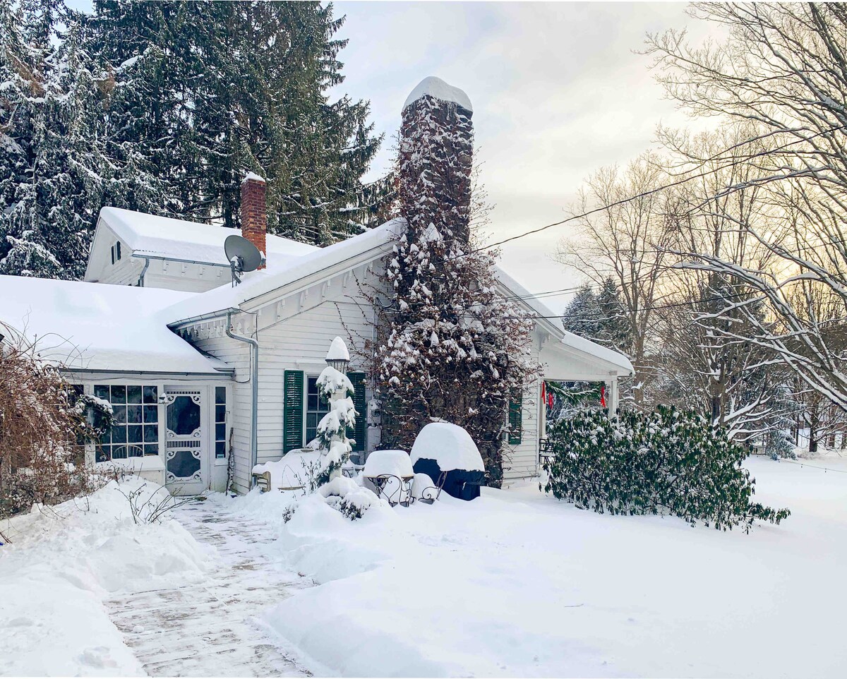 The Writer 's Cottage er lítið hvítt hús við sveitaveg; gamalt, fullkomið og hvetjandi. Hann var byggður á nítjándu öld og er fullkominn fyrir ferðalanga sem eru einir á ferð eða tvo ferðamenn sem skoða Berkshires og Hudson-dalinn. Ef þú ert hrifin/n af sveitalegum byggingum muntu njóta bústaðarins; þetta er ótrúlega notalegur tími. Rúm í queen-stærð og stofa á neðri hæð; rúmgóð loftíbúð uppi með mjóum, lokuðum stiga. Það er aldingarður og grasfleti með grill, hengirúmi og borði úr járnvinnslu.