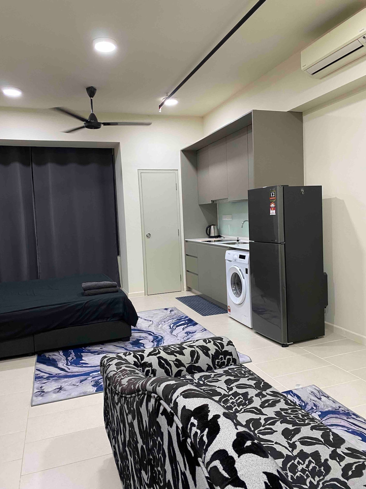 Skoðaðu notalega stúdíóið okkar sem rúmar 2 til 3 manns með queen-rúmi og svefnsófa. Staðurinn er í aðeins 15 mínútna akstursfjarlægð frá KLIA T1/T2 og er umkringdur mörgum veitingastöðum, skyndibitagreinum, matvörum og þvottahúsum, allt í göngufæri. Njóttu allra þæginda, þar á meðal leiksvæðis fyrir börn, grillsvæði, líkamsrækt og sundlaug, með öryggisgæslu allan sólarhringinn. * Ekki er hægt að sleppa farangrinum fyrir innritunartíma. Vegna þess að byggingin er hönnuð þarf að ganga 10 þrepa stiga til að fá lyftu.