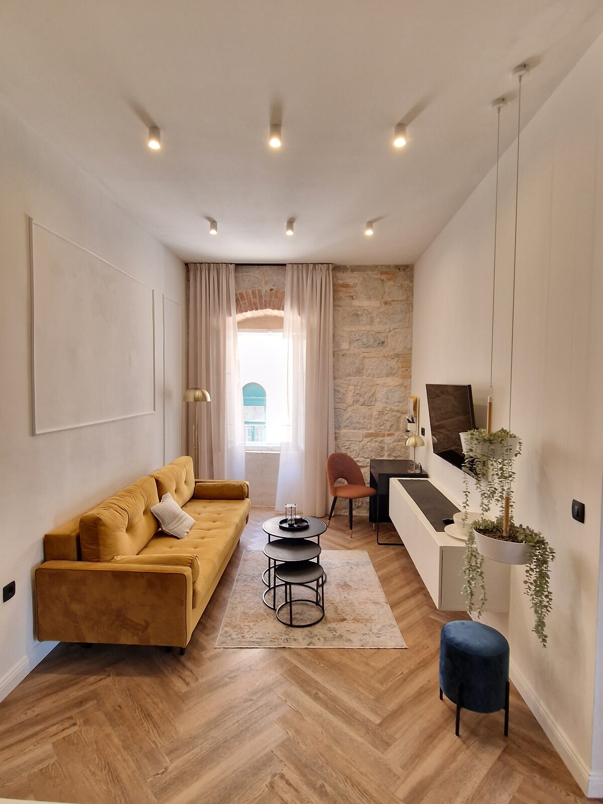 Sökktu þér í kyrrlátt andrúmsloftið í smekklega hönnuðu, eklektísku tvíbýli. Í íbúðinni getur þú uppgötvað samstillta blöndu af andstæðum áferð og mynstrum sem eru undirstrikuð af líflegum litskvettum og fáguðum frönskum glerhurðum sem liggja út á við. Eftir að hafa skoðað líflegu borgina Split skaltu slaka á á sólpallinum með hressandi drykkjum. Upplifðu það besta úr báðum heimum: þægindi og þægindi hótels ásamt næði og notalegheitum heimilisins.
