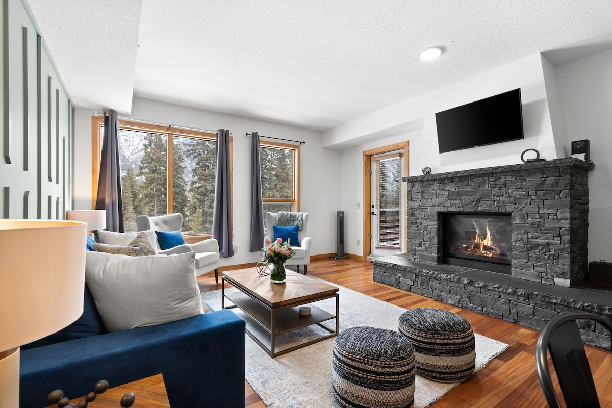 Revive your senses at this luxurious and relaxing retreat in the heart of the Canadian Rockies. Nestled along beautiful Policeman's Creek and surrounded by mountain views, this unit is professionally styled with comfort and relaxation in mind. Guests love the cleanliness, peaceful atmosphere, thoughtful details, and how easy it is to unwind after a day of hiking or sightseeing. Enjoy access to a hot tub and fitness area — everything you need for a truly restorative stay.