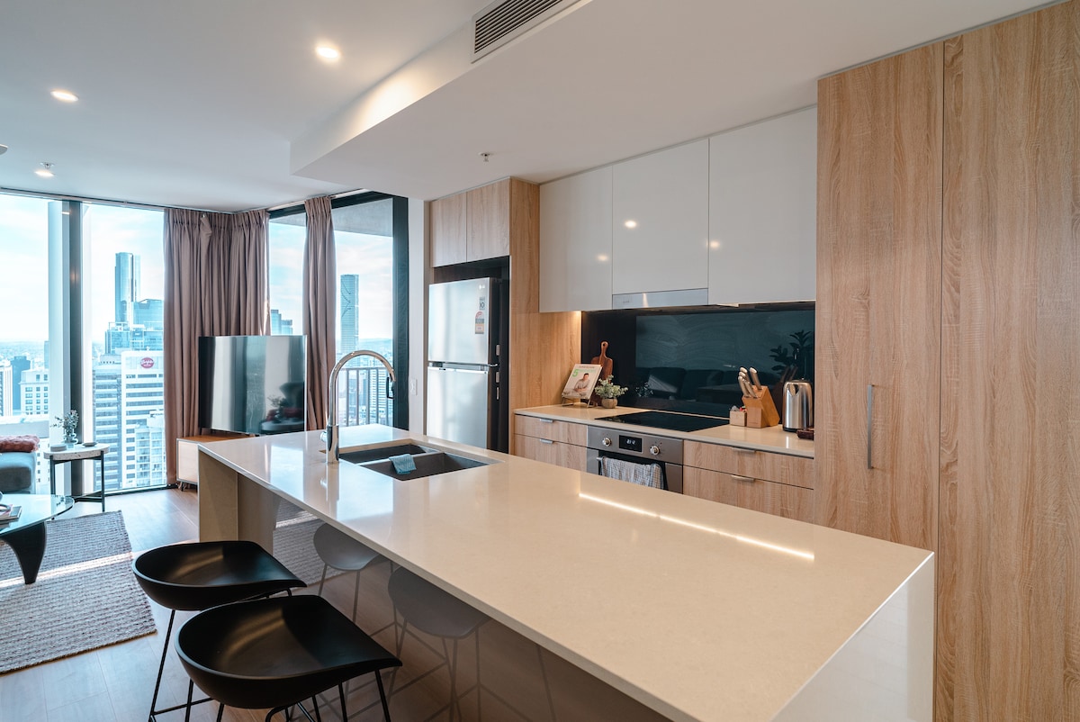 Sveimaðu yfir borginni og slakaðu á í friðsælli, himinhári lúxusíbúð við New Queen's Wharf. Þessi fallega, nýstárlega íbúð er staðsett á 59. hæð og sameinar róandi innréttingar sem eru innblásnar af náttúrunni með ótrúlegu útsýni yfir sjóndeildarhring Brisbane, ána og fjöllin. Stígðu inn í friðsælan stað þar sem mjúkir jarðtónar, náttúruleg áferð og íburðarmikil áferð skapa fullkomið athvarf, hvort sem þú ert hérna í viðskiptaerindum, rómantískri ferð eða friðsælli fríferð í hjarta borgarinnar.