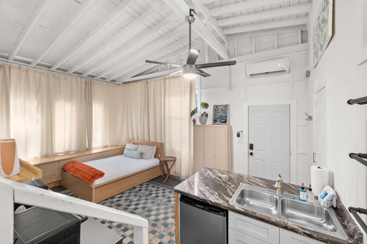 Notaleg stúdíóíbúð með queen-rúmi og sófa til að slaka á. Eldhúskrókur, fullbúið bað og sameiginlegur húsagarður í heillandi göngufæri við Davis Shores. Þetta er hluti af heimili með sérinngangi, bílastæði og einkabaðherbergi. Það er í göngufæri við veitingastaði, smábátahafnir og miðborgina og St. Augustine Beach er í 3 mílna akstursfjarlægð. Engin samskipti við eigendur heimilisins, nema þú viljir hitta okkur eða þú þarft eitthvað. *Vinsamlegast athugaðu að framkvæmdir í nágrenninu geta valdið hávaða á morgnana og síðdegis.
