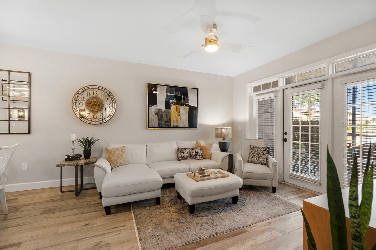 Nálægt verslunum og veitingastöðum. 15 mín akstur í sögulega miðbæinn. Tilvalið fyrir fjölskyldur, pör, vini eða ferðamenn sem ferðast einir. Njóttu þess að hafa enga stiga til að ganga upp! Fjölskylduvænt frí. Nýtt king-rúm. Fullbúið eldhús, ókeypis þráðlaust net, 2 sundlaugar (ein upphituð), þvottavél/þurrkari í fullri stærð í einingu, snjallsjónvarp, gæludýravænt 1 hundur þarf að greiða $ 50 (reiðufé) skráningargjald við innritun. Einnig er greitt fast $ 15 gæludýragjald fyrir gesti sem koma með hund. **Algjörlega REYKLAUS eining**