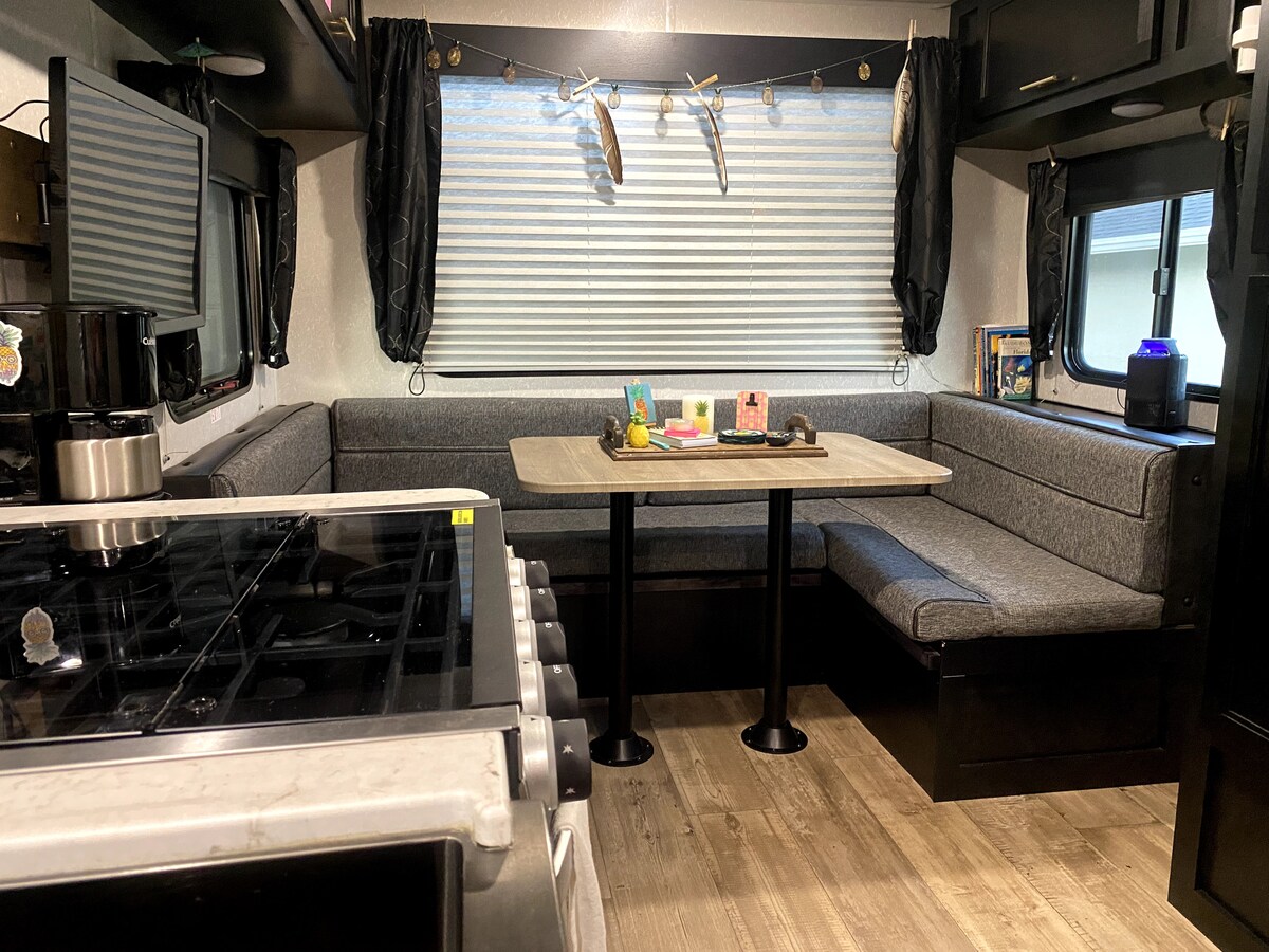 Reconnect with nature while enjoying your own space. Camper includes 4 bunks, 1 queen bed, and a sofa and dining table that can convert. The camper also includes an indoor and outdoor kitchen as well as 2 bathrooms.