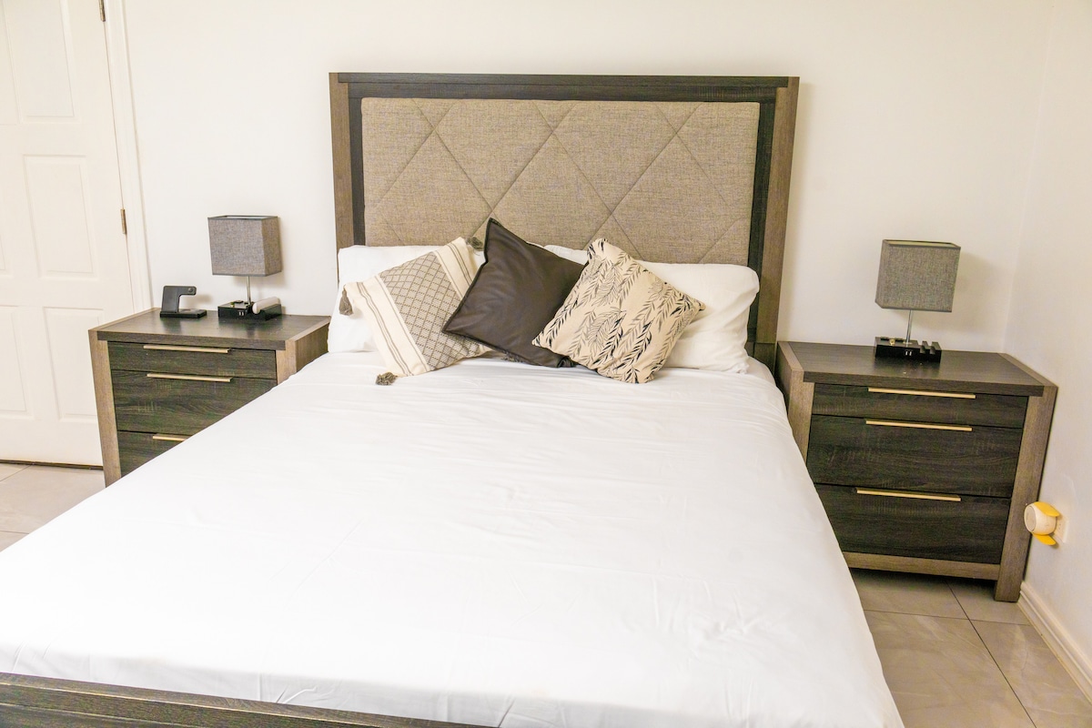 Slakaðu á og slakaðu á í þessu rólega og stílhreina miðlæga rými. Tveggja rúma íbúð með einu baðherbergi. Hverfi bak við hlið 3 mín fjarlægð frá Ian Flemmings-alþjóðaflugvellinum, Marley Beach 12 mín fjarlægð frá Ocho Rios Town Center, Dunn's River Falls, Dolphin Cove og Mystic Mountain