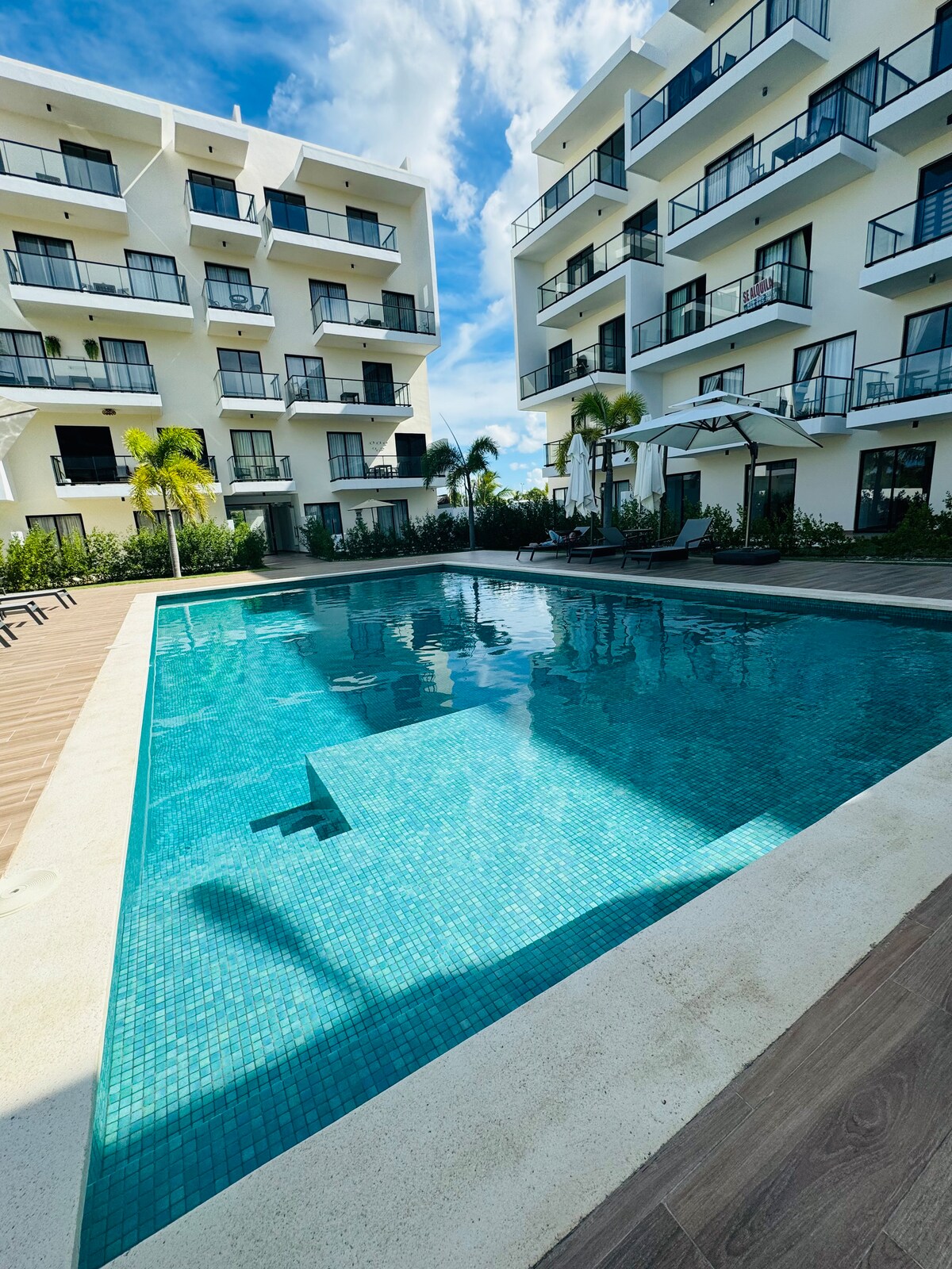 Nútímaleg vin í miðbæ Punta Cana, nokkrum skrefum frá Coco Bongo. Flott íbúð með bjartri stofu, fullbúnu eldhúsi, svefnherbergi með queen-size rúmi, nútímalegu baðherbergi og einkasvölum. Sundlaug, öryggisgæsla allan sólarhringinn og fullkomin staðsetning nálægt veitingastöðum, matvöruverslunum og vinsælum ströndum. Tilvalið fyrir pör, ferðamenn og viðskiptaferðamenn.