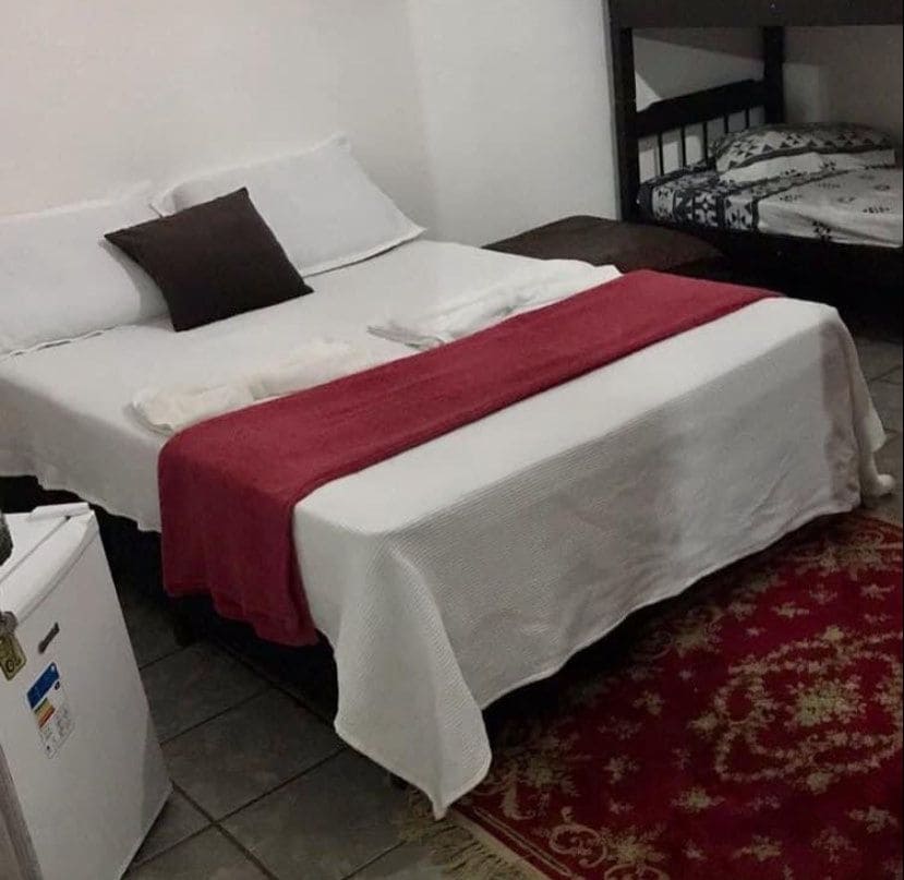 Quartos completos com TV, wifi, ar condicionado, frigobar e banheiro.