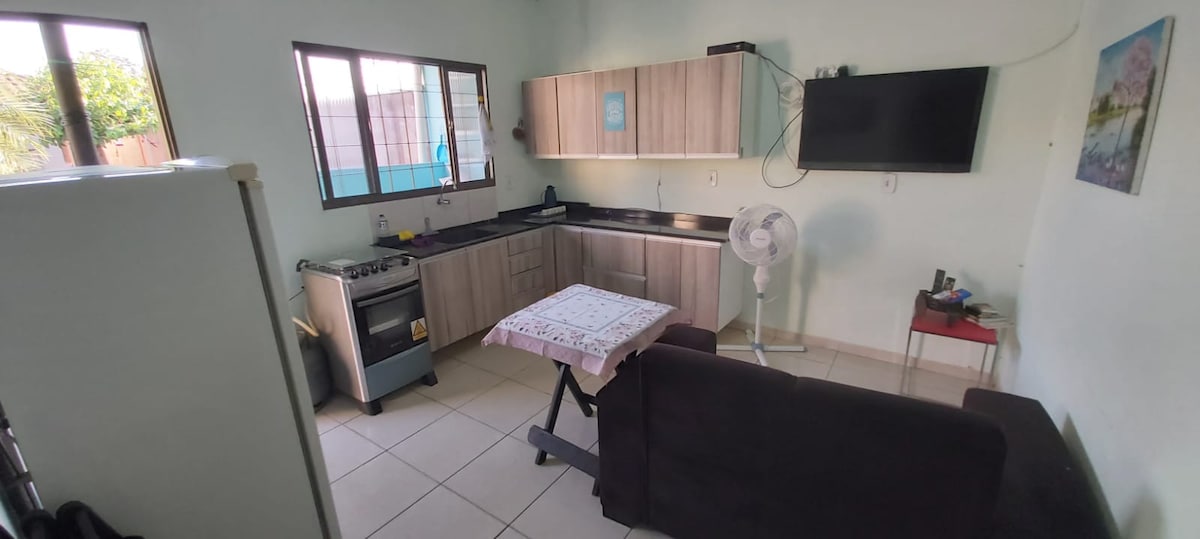 Smáhýsið mitt rúmar frá 1 til þriggja manna fjölskyldu með þægindum, öryggi, sérinngangi og bílskúr. Það er staðsett í rólegu hverfi, með færanlegum vörðum, fyrir framan torg sem býður upp á tómstundir og líkamsrækt utandyra; Það hefur aðra kosti: nálægt matvöruverslunum, verslunarmiðstöðvum, apótekum, veitingastöðum, Parque das Nações Indígenas - einum af ferðamannastöðum borgarinnar; aðgangi að Ring-veginum (suður-, norður- og vesturhluta fylkisins) og miðborginni.