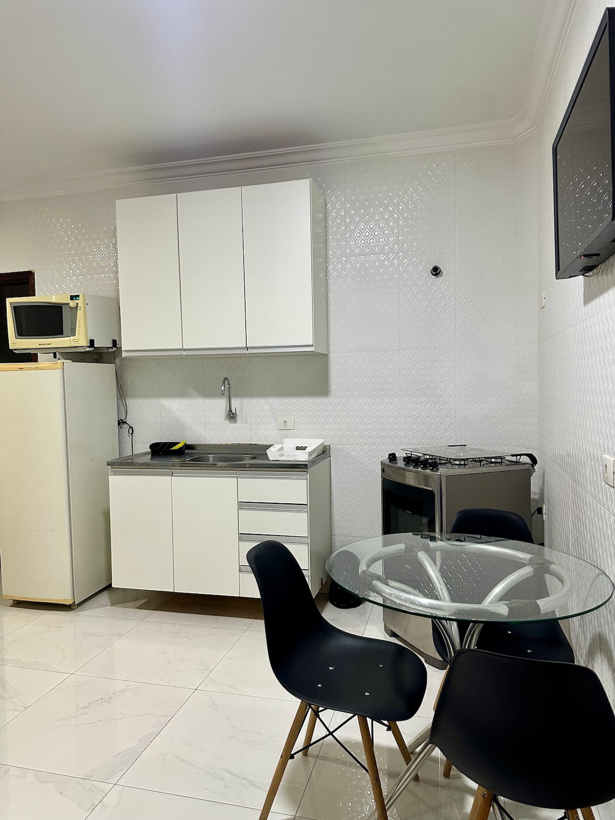 Kitnet inteira, tipo Studio, com ar condicionado, muito bem localizada, perto da UEM, Novo Centro, mercadão, mercados e padarias. Possui 01 cama box de casal, 01 sofá cama, roupeiro, bancada de trabalho com cadeira, mesa com cadeiras, tv 32 com tv box, cozinha completa. Prédio tranquilo e familiar, com Wi-Fi e lavanderia.Fornecemos roupa de cama e banho e mantas de microfibra. Garagem coberta para carros pequenos e médios.