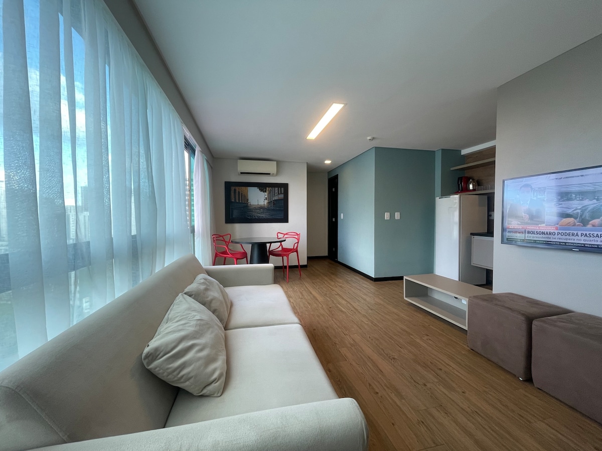 Íbúð með nýjum, rúmgóðum og nútímalegum 25m2 Cama casal Bed and Bath Enxoval Fullbúið eldhús: leirtau, hnífapör, eldunaráhöld, nauðsynleg áhöld 1 brennara spaneldavél Blender Sanduicheira ° Míníbar; Borðstofuborð og stólar Smartv • Kaffivél ° Örbylgjuofn; Vel staðsett bygging Þvottur í sameign Heilsuræktarsalur Sundlaug á þakinu Sérstök eldhúsaðstaða (gegn gjaldi til íbúðarbyggðarinnar) Vinnuaðstaða (samstarf) Snúningur á bílastæði Porter allan sólarhringinn Fyrir þrif eða viðbótargest R$70