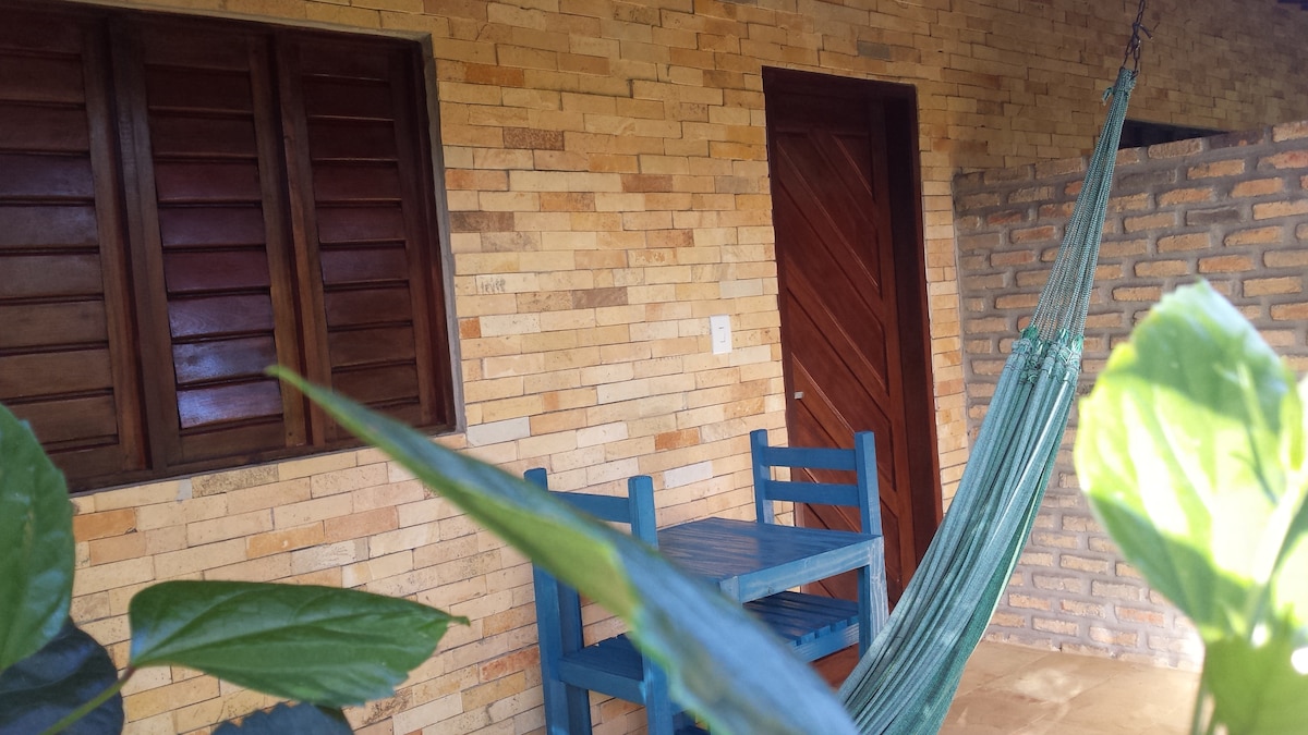 Við erum í Travessa dos Hibiscus í 650 metra fjarlægð frá miðbænum. Stórt stúdíó, rúm og eldhús í einu rými (grunnáhöld, við erum með fleiri ef þörf krefur), sérbaðherbergi. Pocketly sprungin tvöföld dýna. Húsagarður með borði, stólum og hengirúmi. Garður með trjám og bílastæði innandyra. Rúm- og baðföt sem við breytum vikulega. Loftkæling! Við erum með 5G og 2G þráðlaust net. Við erum ekki með sjónvarp. Kettir í garðinum.